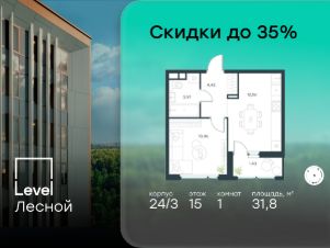 Цена указана с учётом скидки при 100%-й оплате, несубсидированной ипотеке, рассрочке (кроме программы ''Рассрочка 0%'').В районе, утопающем в густой зелени лесов, многочисленных парков и скверов, продаётся 1-комнатная квартира площадью 31.80 кв.м с отделкой white box. Квартира расположена на 15 этаже в жилом комплексе комфорт-класса Level Лесной (компания Level Group/Левел групп). Отличная транспортная доступность:- 25 мин. пешком до станции метро ''Пятницкое шоссе'',- 28 мин. на автобусе до станции метро и МЦД-2 ''Волоколамская'',- 11 мин. на авто до МКАД,- 25 мин. на авто до ТТК. Продуманный архитектурный проект:- Концепция проекта Level Лесной от бюро СПИЧ,- Высотность комплекса до 15 этажей с уникальными видами на лесные массивы и город, - Высота потолков до 3 м,- Современные окна высотой до 1,6 м, в части квартир предусмотрены окна в пол. Высота подоконников 0,6 м, Расположение:Level Лесной строится в зелёной зоне ближайшего Подмосковья, г.о. Красногорск в посёлке Отрадное. Шаговая и автомобильная доступность до метро и больших транспортных артерий города. За 25 минут вы дойдёте до станции метро ''Пятницкое шоссе'', а за 20 минут на машине сможете доехать до станции метро ''Тушинская''. Район окружен роскошной зеленью лесов и парковых зон, занимающих территорию свыше 1 000 гектаров. Помимо благоприятной экологии, здесь множество возможностей для активного отдыха и поддержания физической формы. Облагороженная территории с полностью развитой инфраструктурой. На территории проекта находится детский сад и школа ''Светлые Горы'', которая входит в список лучших частных школ от Forbes Education (по данным на 2023г.). Кроме того, в пешей доступности расположено ещё 8 детских садов, а также запланировано открытие современной муниципальной школы. В непосредственной близости находятся сетевые супермаркеты и локальные магазины, аптеки, клиники, почта, библиотека, салоны красоты, рестораны, спортивные и творческие секции, развивающие детские центры. В 12 минутах пешком расположен торговый парк ''Отрада'' с продуктовым и строительным гипермаркетами, магазинами, кинотеатром и развлечениями для детей. Внутренняя инфраструктура:Мы знаем, как важно, чтобы магазины и сервисы были всегда рядом. В сданных корпусах Level Лесной уже расположена полностью готовая развитая инфраструктура. На первых этажах корпуса 27 предусмотрено ещё 14 коммерческих помещений. Благоустройство:Продуманное пространство и аура приватного европейского городка рождают чувство лёгкости и расслабления у каждого, кто попадает на территорию проекта. Концепцию общественных площадок разработали в партнёрстве два архитектурных бюро: Highlight Architecture и SCAPE. В безопасных дворах без машин каждый обязательно найдёт себе место для вдохновения, отдыха и спорта.
