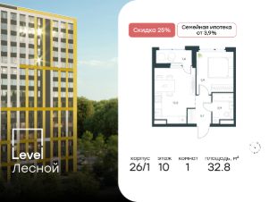 Цена указана с учётом скидки при 100%-й оплате, несубсидированной ипотеке, рассрочке (кроме программы ''Рассрочка 0%''). Субсидированная семейная ипотека. Полная стоимость кредита 20,963 - 23,237% годовых. Ставка 3,9% годовых. Первоначальный взнос от 20,01%. Сумма кредита до 12 млн. руб.В районе, утопающем в густой зелени лесов, многочисленных парков и скверов, продаётся 1-комнатная квартира площадью 32.80 кв.м с отделкой white box. Квартира расположена на 10 этаже в жилом комплексе комфорт-класса Level Лесной (компания Level Group/Левел групп). Отличная транспортная доступность- 25 мин. пешком до станции метро ''Пятницкое шоссе'',- 28 мин. на общественном транспорте до станции метро и МЦД-2 ''Волоколамская'',- 11 мин. на авто до МКАД,- 25 мин. на авто до ТТК.Продуманный архитектурный проект- Концепция проекта Level Лесной от бюро СПИЧ,- Высотность комплекса до 15 этажей с уникальными видами на лесные массивы и город,- Высота потолков до 3 м,- Современные окна высотой до 1,6 м, в части квартир предусмотрены окна в пол. Высота подоконников 0,6 м,РасположениеLevel Лесной строится в зелёной зоне ближайшего Подмосковья, г.о. Красногорск в посёлке Отрадное. Шаговая и автомобильная доступность до метро и больших транспортных артерий города. За 25 минут вы дойдёте до станции метро ''Пятницкое шоссе'' - одной из самых свободных станций Арбатско-Покровской линии, а за 20 минут на машине сможете доехать до станции метро ''Тушинская''. Район окружен роскошной зеленью лесов и парковых зон, занимающих территорию свыше 1 000 гектаров. Помимо благоприятной экологии, здесь множество возможностей для активного отдыха и поддержания физической формы. Облагороженная территории с полностью развитой инфраструктурой. На территории проекта находится детский сад и школа ''Светлые Горы'', которая входит в список лучших частных школ от Forbes Education (по данным на 2023г.). Кроме того, в пешей доступности расположено ещё 8 детских садов, а также запланировано открытие современной муниципальной школы. В непосредственной близости находятся сетевые супермаркеты и локальные магазины, аптеки, клиники, почта, библиотека, салоны красоты, рестораны, спортивные и творческие секции, развивающие детские центры. В 12 минутах пешком расположен торговый парк ''Отрада'' с продуктовым и строительным гипермаркетами, магазинами, кинотеатром и развлечениями для детей.Внутренняя инфраструктураМы знаем, как важно, чтобы магазины и сервисы были всегда рядом. В сданных корпусах Level Лесной уже расположена полностью готовая развитая инфраструктура. На первых этажах корпуса 27 предусмотрено ещё 14 коммерческих помещений.БлагоустройствоПродуманное пространство и аура приватного европейского городка рождают чувство лёгкости и расслабления у каждого, кто попадает на территорию проекта. Концепцию общественных площадок разработали в партнёрстве два архитектурных бюро: Highlight Architecture и SCAPE. В безопасных дворах без машин каждый обязательно найдёт себе место для вд