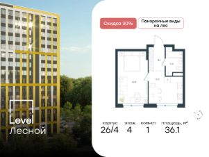 Цена указана с учётом скидкиВ районе, утопающем в густой зелени лесов, многочисленных парков и скверов, продаётся 1-комнатная квартира площадью 36.10 кв.м с отделкой white box. Квартира расположена на 10 этаже в жилом комплексе комфорт-класса Level Лесной (компания Level Group/Левел групп). Отличная транспортная доступность- 25 мин. пешком до станции метро ''Пятницкое шоссе'',- 28 мин. на общественном транспорте до станции метро и МЦД-2 ''Волоколамская'',- 11 мин. на авто до МКАД,- 25 мин. на авто до ТТК.Продуманный архитектурный проект- Концепция проекта Level Лесной от бюро СПИЧ,- Высотность комплекса до 15 этажей с уникальными видами на лесные массивы и город,- Высота потолков до 3 м,- Современные окна высотой до 1,6 м, в части квартир предусмотрены окна в пол. Высота подоконников 0,6 м,РасположениеLevel Лесной строится в зелёной зоне ближайшего Подмосковья, г.о. Красногорск в посёлке Отрадное. Шаговая и автомобильная доступность до метро и больших транспортных артерий города. За 25 минут вы дойдёте до станции метро ''Пятницкое шоссе'' - одной из самых свободных станций Арбатско-Покровской линии, а за 20 минут на машине сможете доехать до станции метро ''Тушинская''. Район окружен роскошной зеленью лесов и парковых зон, занимающих территорию свыше 1 000 гектаров. Помимо благоприятной экологии, здесь множество возможностей для активного отдыха и поддержания физической формы. Облагороженная территории с полностью развитой инфраструктурой. На территории проекта находится детский сад и школа ''Светлые Горы'', которая входит в список лучших частных школ от Forbes Education (по данным на 2023г.). Кроме того, в пешей доступности расположено ещё 8 детских садов, а также запланировано открытие современной муниципальной школы. В непосредственной близости находятся сетевые супермаркеты и локальные магазины, аптеки, клиники, почта, библиотека, салоны красоты, рестораны, спортивные и творческие секции, развивающие детские центры. В 12 минутах пешком расположен торговый парк ''Отрада'' с продуктовым и строительным гипермаркетами, магазинами, кинотеатром и развлечениями для детей.Внутренняя инфраструктураМы знаем, как важно, чтобы магазины и сервисы были всегда рядом. В сданных корпусах Level Лесной уже расположена полностью готовая развитая инфраструктура. На первых этажах корпуса 27 предусмотрено ещё 14 коммерческих помещений.БлагоустройствоПродуманное пространство и аура приватного европейского городка рождают чувство лёгкости и расслабления у каждого, кто попадает на территорию проекта. Концепцию общественных площадок разработали в партнёрстве два архитектурных бюро: Highlight Architecture и SCAPE. В безопасных дворах без машин каждый обязательно найдёт себе место для вдохновения, отдыха и спорта.