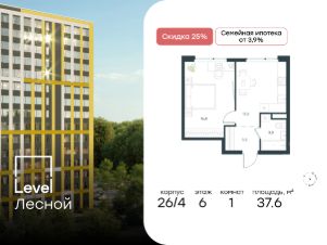 Цена указана с учётом скидки при 100%-й оплате, несубсидированной ипотеке, рассрочке (кроме программы ''Рассрочка 0%''). Субсидированная семейная ипотека. Полная стоимость кредита 20,963 - 23,237% годовых. Ставка 3,9% годовых. Первоначальный взнос от 20,01%. Сумма кредита до 12 млн. руб.В районе, утопающем в густой зелени лесов, многочисленных парков и скверов, продаётся 1-комнатная квартира площадью 37.60 кв.м с отделкой white box. Квартира расположена на 6 этаже в жилом комплексе комфорт-класса Level Лесной (компания Level Group/Левел групп). Отличная транспортная доступность:- 25 мин. пешком до станции метро ''Пятницкое шоссе'',- 28 мин. на автобусе до станции метро и МЦД-2 ''Волоколамская'',- 11 мин. на авто до МКАД,- 25 мин. на авто до ТТК. Продуманный архитектурный проект:- Концепция проекта Level Лесной от бюро СПИЧ,- Высотность комплекса до 15 этажей с уникальными видами на лесные массивы и город, - Высота потолков до 3 м,- Современные окна высотой до 1,6 м, в части квартир предусмотрены окна в пол. Высота подоконников 0,6 м, Расположение:Level Лесной строится в зелёной зоне ближайшего Подмосковья, г.о. Красногорск в посёлке Отрадное. Шаговая и автомобильная доступность до метро и больших транспортных артерий города. За 25 минут вы дойдёте до станции метро ''Пятницкое шоссе'', а за 20 минут на машине сможете доехать до станции метро ''Тушинская''. Район окружен роскошной зеленью лесов и парковых зон, занимающих территорию свыше 1 000 гектаров. Помимо благоприятной экологии, здесь множество возможностей для активного отдыха и поддержания физической формы. Облагороженная территории с полностью развитой инфраструктурой. На территории проекта находится детский сад и школа ''Светлые Горы'', которая входит в список лучших частных школ от Forbes Education (по данным на 2023г.). Кроме того, в пешей доступности расположено ещё 8 детских садов, а также запланировано открытие современной муниципальной школы. В непосредственной близости находятся сетевые супермаркеты и локальные магазины, аптеки, клиники, почта, библиотека, салоны красоты, рестораны, спортивные и творческие секции, развивающие детские центры. В 12 минутах пешком расположен торговый парк ''Отрада'' с продуктовым и строительным гипермаркетами, магазинами, кинотеатром и развлечениями для детей. Внутренняя инфраструктура:Мы знаем, как важно, чтобы магазины и сервисы были всегда рядом. В сданных корпусах Level Лесной уже расположена полностью готовая развитая инфраструктура. На первых этажах корпуса 27 предусмотрено ещё 14 коммерческих помещений. Благоустройство:Продуманное пространство и аура приватного европейского городка рождают чувство лёгкости и расслабления у каждого, кто попадает на территорию проекта. Концепцию общественных площадок разработали в партнёрстве два архитектурных бюро: Highlight Architecture и SCAPE. В безопасных дворах без машин каждый обязательно найдёт себе место для вдохновения, отдыха и спорта.