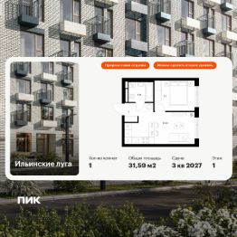 Продаётся 1-комн. квартира площадью 31,59 кв.м на 1 этаже 9 этажного дома (Корпус 3.2, Секция 3) проекта ПИК Ильинские луга. Светлый просторный подъезд на уровне земли, функциональная планировка, большие окна, предчистовая отделка. Жилой район ''Ильинские луга'' находится в 10 километрах от МКАД по Новорижскому шоссе, в 20 минутах на автомобиле от станций метро ''Волоколамская'', ''Тушинская'' и ''Строгино''. В будущем ближе к проекту, в 9 минутах пути на машине, откроется станция ''Ильинская'' Рублёво-Архангельской линии, которая будет соединять Арбатско-Покровскую линию и Большую кольцевую линию.Сейчас в квартале начались продажи в корпусах 3.2, 3.3, 3.4, 3.5 и 3.6.''Ильинские луга'' — масштабный проект, в который входит девять детских садов, четыре школы и поликлиника. Он строится в престижном и экологичном районе среди лесов и памятников природы. За 5 минут от жилого квартала можно доехать до Рублёво-Успенского шоссе, а за 30 минут — до центра Москвы. До крупного торгового центра ''РИГАМОЛЛ'' всего 5 минут на автомобиле, а до ТЦ ''Твой дом'' и гипермаркета ''Глобус'' — 10 минут.В ''Ильинских лугах'' строятся только девятиэтажные дома — такая архитектура соответствует спокойной жизни за городом. В каждом дворе-парке есть места для отдыха, детские и спортивные площадки. А ещё, здесь уже открыт большой PlayHub ''Гравити'' — современное игровое пространство с космической тематикой, холмами, зонами для игр и отдыха жителей любого возраста.На первых этажах уже работают магазины, кафе и пекарни.Места для отдыха от ''Ильинских лугов'' тоже недалеко: 10 минут на машине — и вы в музее-усадьбе ''Архангельское''. Также рядом находится Лохин остров — памятник природы, где водятся речные черепахи, есть места для кемпинга и возможность сплавиться по реке. Артикул 999730 (Застройщик ООО ''СЗ ''ГРАДОЛИМП'')