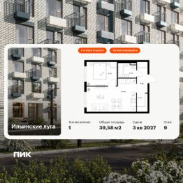 Продаётся 1-комн. квартира площадью 39,58 кв.м на 9 этаже 9 этажного дома (Корпус 4.1, Секция 1) проекта ПИК Ильинские луга. Светлый просторный подъезд на уровне земли, функциональная планировка, большие окна, c отделкой. Жилой район ''Ильинские луга'' находится в 10 километрах от МКАД по Новорижскому шоссе, в 20 минутах на автомобиле от станций метро ''Волоколамская'', ''Тушинская'' и ''Строгино''. В будущем ближе к проекту, в 9 минутах пути на машине, откроется станция ''Ильинская'' Рублёво-Архангельской линии, которая будет соединять Арбатско-Покровскую линию и Большую кольцевую линию.Сейчас в квартале начались продажи в корпусах 3.2, 3.3, 3.4, 3.5 и 3.6.''Ильинские луга'' — масштабный проект, в который входит девять детских садов, четыре школы и поликлиника. Он строится в престижном и экологичном районе среди лесов и памятников природы. За 5 минут от жилого квартала можно доехать до Рублёво-Успенского шоссе, а за 30 минут — до центра Москвы. До крупного торгового центра ''РИГАМОЛЛ'' всего 5 минут на автомобиле, а до ТЦ ''Твой дом'' и гипермаркета ''Глобус'' — 10 минут.В ''Ильинских лугах'' строятся только девятиэтажные дома — такая архитектура соответствует спокойной жизни за городом. В каждом дворе-парке есть места для отдыха, детские и спортивные площадки. А ещё, здесь уже открыт большой PlayHub ''Гравити'' — современное игровое пространство с космической тематикой, холмами, зонами для игр и отдыха жителей любого возраста.На первых этажах уже работают магазины, кафе и пекарни.Места для отдыха от ''Ильинских лугов'' тоже недалеко: 10 минут на машине — и вы в музее-усадьбе ''Архангельское''. Также рядом находится Лохин остров — памятник природы, где водятся речные черепахи, есть места для кемпинга и возможность сплавиться по реке. Артикул 1015783 (Застройщик ООО ''СЗ ''ГРАДОЛИМП'')