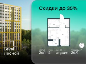 Цена указана с учётом скидки при 100%-й оплате, несубсидированной ипотеке, рассрочке (кроме программы ''Рассрочка 0%'').В районе, утопающем в густой зелени лесов, многочисленных парков и скверов, продаётся студия площадью 26.90 кв.м с отделкой white box. Квартира расположена на 2 этаже в жилом комплексе комфорт-класса Level Лесной (компания Level Group/Левел групп). Отличная транспортная доступность:- 25 мин. пешком до станции метро ''Пятницкое шоссе'',- 28 мин. на автобусе до станции метро и МЦД-2 ''Волоколамская'',- 11 мин. на авто до МКАД,- 25 мин. на авто до ТТК. Продуманный архитектурный проект:- Концепция проекта Level Лесной от бюро СПИЧ,- Высотность комплекса до 15 этажей с уникальными видами на лесные массивы и город, - Высота потолков до 3 м,- Современные окна высотой до 1,6 м, в части квартир предусмотрены окна в пол. Высота подоконников 0,6 м, Расположение:Level Лесной строится в зелёной зоне ближайшего Подмосковья, г.о. Красногорск в посёлке Отрадное. Шаговая и автомобильная доступность до метро и больших транспортных артерий города. За 25 минут вы дойдёте до станции метро ''Пятницкое шоссе'', а за 20 минут на машине сможете доехать до станции метро ''Тушинская''. Район окружен роскошной зеленью лесов и парковых зон, занимающих территорию свыше 1 000 гектаров. Помимо благоприятной экологии, здесь множество возможностей для активного отдыха и поддержания физической формы. Облагороженная территории с полностью развитой инфраструктурой. На территории проекта находится детский сад и школа ''Светлые Горы'', которая входит в список лучших частных школ от Forbes Education (по данным на 2023г.). Кроме того, в пешей доступности расположено ещё 8 детских садов, а также запланировано открытие современной муниципальной школы. В непосредственной близости находятся сетевые супермаркеты и локальные магазины, аптеки, клиники, почта, библиотека, салоны красоты, рестораны, спортивные и творческие секции, развивающие детские центры. В 12 минутах пешком расположен торговый парк ''Отрада'' с продуктовым и строительным гипермаркетами, магазинами, кинотеатром и развлечениями для детей. Внутренняя инфраструктура:Мы знаем, как важно, чтобы магазины и сервисы были всегда рядом. В сданных корпусах Level Лесной уже расположена полностью готовая развитая инфраструктура. На первых этажах корпуса 27 предусмотрено ещё 14 коммерческих помещений. Благоустройство:Продуманное пространство и аура приватного европейского городка рождают чувство лёгкости и расслабления у каждого, кто попадает на территорию проекта. Концепцию общественных площадок разработали в партнёрстве два архитектурных бюро: Highlight Architecture и SCAPE. В безопасных дворах без машин каждый обязательно найдёт себе место для вдохновения, отдыха и спорта.