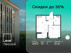 Цена указана с учётом скидки при 100%-й оплате, несубсидированной ипотеке, рассрочке (кроме программы ''Рассрочка 0%'').В районе, утопающем в густой зелени лесов, многочисленных парков и скверов, продаётся 1-комнатная квартира площадью 31.60 кв.м с отделкой white box. Квартира расположена на 13 этаже в жилом комплексе комфорт-класса Level Лесной (компания Level Group/Левел групп). Отличная транспортная доступность:- 25 мин. пешком до станции метро ''Пятницкое шоссе'',- 28 мин. на автобусе до станции метро и МЦД-2 ''Волоколамская'',- 11 мин. на авто до МКАД,- 25 мин. на авто до ТТК. Продуманный архитектурный проект:- Концепция проекта Level Лесной от бюро СПИЧ,- Высотность комплекса до 15 этажей с уникальными видами на лесные массивы и город, - Высота потолков до 3 м,- Современные окна высотой до 1,6 м, в части квартир предусмотрены окна в пол. Высота подоконников 0,6 м, Расположение:Level Лесной строится в зелёной зоне ближайшего Подмосковья, г.о. Красногорск в посёлке Отрадное. Шаговая и автомобильная доступность до метро и больших транспортных артерий города. За 25 минут вы дойдёте до станции метро ''Пятницкое шоссе'', а за 20 минут на машине сможете доехать до станции метро ''Тушинская''. Район окружен роскошной зеленью лесов и парковых зон, занимающих территорию свыше 1 000 гектаров. Помимо благоприятной экологии, здесь множество возможностей для активного отдыха и поддержания физической формы. Облагороженная территории с полностью развитой инфраструктурой. На территории проекта находится детский сад и школа ''Светлые Горы'', которая входит в список лучших частных школ от Forbes Education (по данным на 2023г.). Кроме того, в пешей доступности расположено ещё 8 детских садов, а также запланировано открытие современной муниципальной школы. В непосредственной близости находятся сетевые супермаркеты и локальные магазины, аптеки, клиники, почта, библиотека, салоны красоты, рестораны, спортивные и творческие секции, развивающие детские центры. В 12 минутах пешком расположен торговый парк ''Отрада'' с продуктовым и строительным гипермаркетами, магазинами, кинотеатром и развлечениями для детей. Внутренняя инфраструктура:Мы знаем, как важно, чтобы магазины и сервисы были всегда рядом. В сданных корпусах Level Лесной уже расположена полностью готовая развитая инфраструктура. На первых этажах корпуса 27 предусмотрено ещё 14 коммерческих помещений. Благоустройство:Продуманное пространство и аура приватного европейского городка рождают чувство лёгкости и расслабления у каждого, кто попадает на территорию проекта. Концепцию общественных площадок разработали в партнёрстве два архитектурных бюро: Highlight Architecture и SCAPE. В безопасных дворах без машин каждый обязательно найдёт себе место для вдохновения, отдыха и спорта.