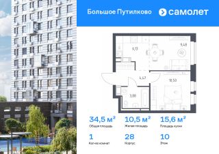 Предлагается 1-комнатная квартира комфорт-класса 34,33 кв.м в корпусе 28 на 10 этаже, в ЖК ''Большое Путилково''Квартира с чистовой отделкой. Доступность дополнительных опций уточняйте на сайте застройщика.Планировкой предусмотрены:Коридор_1 - 4,47 м²Кухня-ниша_1 - 6,0 м²Гостиная_1 - 9,48 м²Жилая_комната_1 - 10,5 м²СУ_1 - 3,88 м²Приобрести квартиру возможно по специальным акциям от застройщика, с текущими условиями акций можно ознакомиться в блоке Акций.Цена динамическая и может отличаться, уточняйте актуальность у застройщика.''Большое Путилково'' — масштабный жилой комплекс рядом с Алешкинским и Новогорским лесопарками. Мы уже построили и открыли 3 детских сада и школу, на первых этажах корпусов работают магазины, аптеки, кафе и пекарни. Удобное расположение проекта позволяет всего за 10 минут добраться до 4 станций метро.Во дворах обустроены детские площадки и зоны для отдыха. Все квартиры сдаются с готовой отделкой - переезжайте сразу после получения ключей!