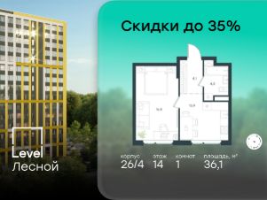 Цена указана с учётом скидки при 100%-й оплате, несубсидированной ипотеке, рассрочке (кроме программы ''Рассрочка 0%'').В районе, утопающем в густой зелени лесов, многочисленных парков и скверов, продаётся 1-комнатная квартира площадью 38.00 кв.м без отделки. Квартира расположена на 12 этаже в жилом комплексе комфорт-класса Level Лесной (компания Level Group/Левел групп). Отличная транспортная доступность:- 25 мин. пешком до станции метро ''Пятницкое шоссе'',- 28 мин. на автобусе до станции метро и МЦД-2 ''Волоколамская'',- 11 мин. на авто до МКАД,- 25 мин. на авто до ТТК. Продуманный архитектурный проект:- Концепция проекта Level Лесной от бюро СПИЧ,- Высотность комплекса до 15 этажей с уникальными видами на лесные массивы и город, - Высота потолков до 3 м,- Современные окна высотой до 1,6 м, в части квартир предусмотрены окна в пол. Высота подоконников 0,6 м, Расположение:Level Лесной строится в зелёной зоне ближайшего Подмосковья, г.о. Красногорск в посёлке Отрадное. Шаговая и автомобильная доступность до метро и больших транспортных артерий города. За 25 минут вы дойдёте до станции метро ''Пятницкое шоссе'', а за 20 минут на машине сможете доехать до станции метро ''Тушинская''. Район окружен роскошной зеленью лесов и парковых зон, занимающих территорию свыше 1 000 гектаров. Помимо благоприятной экологии, здесь множество возможностей для активного отдыха и поддержания физической формы. Облагороженная территории с полностью развитой инфраструктурой. На территории проекта находится детский сад и школа ''Светлые Горы'', которая входит в список лучших частных школ от Forbes Education (по данным на 2023г.). Кроме того, в пешей доступности расположено ещё 8 детских садов, а также запланировано открытие современной муниципальной школы. В непосредственной близости находятся сетевые супермаркеты и локальные магазины, аптеки, клиники, почта, библиотека, салоны красоты, рестораны, спортивные и творческие секции, развивающие детские центры. В 12 минутах пешком расположен торговый парк ''Отрада'' с продуктовым и строительным гипермаркетами, магазинами, кинотеатром и развлечениями для детей. Внутренняя инфраструктура:Мы знаем, как важно, чтобы магазины и сервисы были всегда рядом. В сданных корпусах Level Лесной уже расположена полностью готовая развитая инфраструктура. На первых этажах корпуса 27 предусмотрено ещё 14 коммерческих помещений. Благоустройство:Продуманное пространство и аура приватного европейского городка рождают чувство лёгкости и расслабления у каждого, кто попадает на территорию проекта. Концепцию общественных площадок разработали в партнёрстве два архитектурных бюро: Highlight Architecture и SCAPE. В безопасных дворах без машин каждый обязательно найдёт себе место для вдохновения, отдыха и спорта.