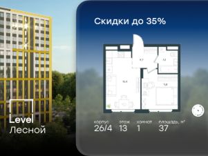 Цена указана с учётом скидки при 100%-й оплате, несубсидированной ипотеке, рассрочке (кроме программы ''Рассрочка 0%'').В районе, утопающем в густой зелени лесов, многочисленных парков и скверов, продаётся 1-комнатная квартира площадью 37.60 кв.м с отделкой white box. Квартира расположена на 13 этаже в жилом комплексе комфорт-класса Level Лесной (компания Level Group/Левел групп). Отличная транспортная доступность:- 25 мин. пешком до станции метро ''Пятницкое шоссе'',- 28 мин. на автобусе до станции метро и МЦД-2 ''Волоколамская'',- 11 мин. на авто до МКАД,- 25 мин. на авто до ТТК. Продуманный архитектурный проект:- Концепция проекта Level Лесной от бюро СПИЧ,- Высотность комплекса до 15 этажей с уникальными видами на лесные массивы и город, - Высота потолков до 3 м,- Современные окна высотой до 1,6 м, в части квартир предусмотрены окна в пол. Высота подоконников 0,6 м, Расположение:Level Лесной строится в зелёной зоне ближайшего Подмосковья, г.о. Красногорск в посёлке Отрадное. Шаговая и автомобильная доступность до метро и больших транспортных артерий города. За 25 минут вы дойдёте до станции метро ''Пятницкое шоссе'', а за 20 минут на машине сможете доехать до станции метро ''Тушинская''. Район окружен роскошной зеленью лесов и парковых зон, занимающих территорию свыше 1 000 гектаров. Помимо благоприятной экологии, здесь множество возможностей для активного отдыха и поддержания физической формы. Облагороженная территории с полностью развитой инфраструктурой. На территории проекта находится детский сад и школа ''Светлые Горы'', которая входит в список лучших частных школ от Forbes Education (по данным на 2023г.). Кроме того, в пешей доступности расположено ещё 8 детских садов, а также запланировано открытие современной муниципальной школы. В непосредственной близости находятся сетевые супермаркеты и локальные магазины, аптеки, клиники, почта, библиотека, салоны красоты, рестораны, спортивные и творческие секции, развивающие детские центры. В 12 минутах пешком расположен торговый парк ''Отрада'' с продуктовым и строительным гипермаркетами, магазинами, кинотеатром и развлечениями для детей. Внутренняя инфраструктура:Мы знаем, как важно, чтобы магазины и сервисы были всегда рядом. В сданных корпусах Level Лесной уже расположена полностью готовая развитая инфраструктура. На первых этажах корпуса 27 предусмотрено ещё 14 коммерческих помещений. Благоустройство:Продуманное пространство и аура приватного европейского городка рождают чувство лёгкости и расслабления у каждого, кто попадает на территорию проекта. Концепцию общественных площадок разработали в партнёрстве два архитектурных бюро: Highlight Architecture и SCAPE. В безопасных дворах без машин каждый обязательно найдёт себе место для вдохновения, отдыха и спорта.