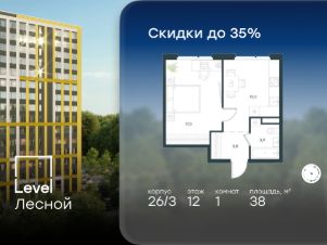 Цена указана с учётом скидки при 100%-й оплате, несубсидированной ипотеке, рассрочке (кроме программы ''Рассрочка 0%'').В районе, утопающем в густой зелени лесов, многочисленных парков и скверов, продаётся 1-комнатная квартира площадью 38.00 кв.м без отделки. Квартира расположена на 12 этаже в жилом комплексе комфорт-класса Level Лесной (компания Level Group/Левел групп). Отличная транспортная доступность:- 25 мин. пешком до станции метро ''Пятницкое шоссе'',- 28 мин. на автобусе до станции метро и МЦД-2 ''Волоколамская'',- 11 мин. на авто до МКАД,- 25 мин. на авто до ТТК. Продуманный архитектурный проект:- Концепция проекта Level Лесной от бюро СПИЧ,- Высотность комплекса до 15 этажей с уникальными видами на лесные массивы и город, - Высота потолков до 3 м,- Современные окна высотой до 1,6 м, в части квартир предусмотрены окна в пол. Высота подоконников 0,6 м, Расположение:Level Лесной строится в зелёной зоне ближайшего Подмосковья, г.о. Красногорск в посёлке Отрадное. Шаговая и автомобильная доступность до метро и больших транспортных артерий города. За 25 минут вы дойдёте до станции метро ''Пятницкое шоссе'', а за 20 минут на машине сможете доехать до станции метро ''Тушинская''. Район окружен роскошной зеленью лесов и парковых зон, занимающих территорию свыше 1 000 гектаров. Помимо благоприятной экологии, здесь множество возможностей для активного отдыха и поддержания физической формы. Облагороженная территории с полностью развитой инфраструктурой. На территории проекта находится детский сад и школа ''Светлые Горы'', которая входит в список лучших частных школ от Forbes Education (по данным на 2023г.). Кроме того, в пешей доступности расположено ещё 8 детских садов, а также запланировано открытие современной муниципальной школы. В непосредственной близости находятся сетевые супермаркеты и локальные магазины, аптеки, клиники, почта, библиотека, салоны красоты, рестораны, спортивные и творческие секции, развивающие детские центры. В 12 минутах пешком расположен торговый парк ''Отрада'' с продуктовым и строительным гипермаркетами, магазинами, кинотеатром и развлечениями для детей. Внутренняя инфраструктура:Мы знаем, как важно, чтобы магазины и сервисы были всегда рядом. В сданных корпусах Level Лесной уже расположена полностью готовая развитая инфраструктура. На первых этажах корпуса 27 предусмотрено ещё 14 коммерческих помещений. Благоустройство:Продуманное пространство и аура приватного европейского городка рождают чувство лёгкости и расслабления у каждого, кто попадает на территорию проекта. Концепцию общественных площадок разработали в партнёрстве два архитектурных бюро: Highlight Architecture и SCAPE. В безопасных дворах без машин каждый обязательно найдёт себе место для вдохновения, отдыха и спорта.