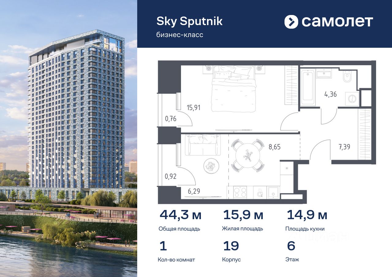 Предлагаются 1-комнатные апартаменты бизнес-класса 44,28 кв.м в корпусе 19 на 6 этаже, в Sky Sputnik Апартаменты без отделки. Доступность опции ''отделка'' и возможность комплектации мебелью и декором уточняйте у застройщика. Прописка не предусмотрена в рамках юридического статуса - апартаменты. Приобрести апартаменты возможно по специальным акциям от застройщика, с текущими условиями акций можно ознакомиться в блоке Акций. Цена динамическая и может отличаться, уточняйте актуальность у застройщика. Квартал находится на северо-западе Московской области, в 200 км от МКАД. Из окон домов открывается потрясающий вид на парк ''Липовая Роща'' и Живописную бухту. Уже открыта вся необходимая инфраструктура: 3 детских сада, частная школа, аптеки, коворкинги, магазины и кафе. В 2027 году рядом с проектом появится станция метро ''Липовая Роща''. До станции метро Строгино можно дойти за 25 минут. Все апартаменты сдаются с отделкой и мебелью.