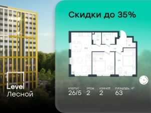 Цена указана с учётом скидки при 100%-й оплате, несубсидированной ипотеке, рассрочке (кроме программы ''Рассрочка 0%'').В районе, утопающем в густой зелени лесов, многочисленных парков и скверов, продаётся 2-комнатная квартира площадью 63.00 кв.м с отделкой white box. Квартира расположена на 2 этаже в жилом комплексе комфорт-класса Level Лесной (компания Level Group/Левел групп). Отличная транспортная доступность:- 25 мин. пешком до станции метро ''Пятницкое шоссе'',- 28 мин. на автобусе до станции метро и МЦД-2 ''Волоколамская'',- 11 мин. на авто до МКАД,- 25 мин. на авто до ТТК. Продуманный архитектурный проект:- Концепция проекта Level Лесной от бюро СПИЧ,- Высотность комплекса до 15 этажей с уникальными видами на лесные массивы и город, - Высота потолков до 3 м,- Современные окна высотой до 1,6 м, в части квартир предусмотрены окна в пол. Высота подоконников 0,6 м, Расположение:Level Лесной строится в зелёной зоне ближайшего Подмосковья, г.о. Красногорск в посёлке Отрадное. Шаговая и автомобильная доступность до метро и больших транспортных артерий города. За 25 минут вы дойдёте до станции метро ''Пятницкое шоссе'', а за 20 минут на машине сможете доехать до станции метро ''Тушинская''. Район окружен роскошной зеленью лесов и парковых зон, занимающих территорию свыше 1 000 гектаров. Помимо благоприятной экологии, здесь множество возможностей для активного отдыха и поддержания физической формы. Облагороженная территории с полностью развитой инфраструктурой. На территории проекта находится детский сад и школа ''Светлые Горы'', которая входит в список лучших частных школ от Forbes Education (по данным на 2023г.). Кроме того, в пешей доступности расположено ещё 8 детских садов, а также запланировано открытие современной муниципальной школы. В непосредственной близости находятся сетевые супермаркеты и локальные магазины, аптеки, клиники, почта, библиотека, салоны красоты, рестораны, спортивные и творческие секции, развивающие детские центры. В 12 минутах пешком расположен торговый парк ''Отрада'' с продуктовым и строительным гипермаркетами, магазинами, кинотеатром и развлечениями для детей. Внутренняя инфраструктура:Мы знаем, как важно, чтобы магазины и сервисы были всегда рядом. В сданных корпусах Level Лесной уже расположена полностью готовая развитая инфраструктура. На первых этажах корпуса 27 предусмотрено ещё 14 коммерческих помещений. Благоустройство:Продуманное пространство и аура приватного европейского городка рождают чувство лёгкости и расслабления у каждого, кто попадает на территорию проекта. Концепцию общественных площадок разработали в партнёрстве два архитектурных бюро: Highlight Architecture и SCAPE. В безопасных дворах без машин каждый обязательно найдёт себе место для вдохновения, отдыха и спорта.