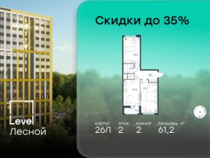 Цена указана с учётом скидки при 100%-й оплате, несубсидированной ипотеке, рассрочке (кроме программы ''Рассрочка 0%'').В районе, утопающем в густой зелени лесов, многочисленных парков и скверов, продаётся 2-комнатная квартира площадью 61.20 кв.м с отделкой white box. Квартира расположена на 2 этаже в жилом комплексе комфорт-класса Level Лесной (компания Level Group/Левел групп). Отличная транспортная доступность:- 25 мин. пешком до станции метро ''Пятницкое шоссе'',- 28 мин. на автобусе до станции метро и МЦД-2 ''Волоколамская'',- 11 мин. на авто до МКАД,- 25 мин. на авто до ТТК. Продуманный архитектурный проект:- Концепция проекта Level Лесной от бюро СПИЧ,- Высотность комплекса до 15 этажей с уникальными видами на лесные массивы и город, - Высота потолков до 3 м,- Современные окна высотой до 1,6 м, в части квартир предусмотрены окна в пол. Высота подоконников 0,6 м, Расположение:Level Лесной строится в зелёной зоне ближайшего Подмосковья, г.о. Красногорск в посёлке Отрадное. Шаговая и автомобильная доступность до метро и больших транспортных артерий города. За 25 минут вы дойдёте до станции метро ''Пятницкое шоссе'', а за 20 минут на машине сможете доехать до станции метро ''Тушинская''. Район окружен роскошной зеленью лесов и парковых зон, занимающих территорию свыше 1 000 гектаров. Помимо благоприятной экологии, здесь множество возможностей для активного отдыха и поддержания физической формы. Облагороженная территории с полностью развитой инфраструктурой. На территории проекта находится детский сад и школа ''Светлые Горы'', которая входит в список лучших частных школ от Forbes Education (по данным на 2023г.). Кроме того, в пешей доступности расположено ещё 8 детских садов, а также запланировано открытие современной муниципальной школы. В непосредственной близости находятся сетевые супермаркеты и локальные магазины, аптеки, клиники, почта, библиотека, салоны красоты, рестораны, спортивные и творческие секции, развивающие детские центры. В 12 минутах пешком расположен торговый парк ''Отрада'' с продуктовым и строительным гипермаркетами, магазинами, кинотеатром и развлечениями для детей. Внутренняя инфраструктура:Мы знаем, как важно, чтобы магазины и сервисы были всегда рядом. В сданных корпусах Level Лесной уже расположена полностью готовая развитая инфраструктура. На первых этажах корпуса 27 предусмотрено ещё 14 коммерческих помещений. Благоустройство:Продуманное пространство и аура приватного европейского городка рождают чувство лёгкости и расслабления у каждого, кто попадает на территорию проекта. Концепцию общественных площадок разработали в партнёрстве два архитектурных бюро: Highlight Architecture и SCAPE. В безопасных дворах без машин каждый обязательно найдёт себе место для вдохновения, отдыха и спорта.