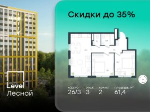 Цена указана с учётом скидки при 100%-й оплате, несубсидированной ипотеке, рассрочке (кроме программы ''Рассрочка 0%'').В районе, утопающем в густой зелени лесов, многочисленных парков и скверов, продаётся 2-комнатная квартира площадью 61.40 кв.м без отделки. Квартира расположена на 3 этаже в жилом комплексе комфорт-класса Level Лесной (компания Level Group/Левел групп). Отличная транспортная доступность:- 25 мин. пешком до станции метро ''Пятницкое шоссе'',- 28 мин. на автобусе до станции метро и МЦД-2 ''Волоколамская'',- 11 мин. на авто до МКАД,- 25 мин. на авто до ТТК. Продуманный архитектурный проект:- Концепция проекта Level Лесной от бюро СПИЧ,- Высотность комплекса до 15 этажей с уникальными видами на лесные массивы и город, - Высота потолков до 3 м,- Современные окна высотой до 1,6 м, в части квартир предусмотрены окна в пол. Высота подоконников 0,6 м, Расположение:Level Лесной строится в зелёной зоне ближайшего Подмосковья, г.о. Красногорск в посёлке Отрадное. Шаговая и автомобильная доступность до метро и больших транспортных артерий города. За 25 минут вы дойдёте до станции метро ''Пятницкое шоссе'', а за 20 минут на машине сможете доехать до станции метро ''Тушинская''. Район окружен роскошной зеленью лесов и парковых зон, занимающих территорию свыше 1 000 гектаров. Помимо благоприятной экологии, здесь множество возможностей для активного отдыха и поддержания физической формы. Облагороженная территории с полностью развитой инфраструктурой. На территории проекта находится детский сад и школа ''Светлые Горы'', которая входит в список лучших частных школ от Forbes Education (по данным на 2023г.). Кроме того, в пешей доступности расположено ещё 8 детских садов, а также запланировано открытие современной муниципальной школы. В непосредственной близости находятся сетевые супермаркеты и локальные магазины, аптеки, клиники, почта, библиотека, салоны красоты, рестораны, спортивные и творческие секции, развивающие детские центры. В 12 минутах пешком расположен торговый парк ''Отрада'' с продуктовым и строительным гипермаркетами, магазинами, кинотеатром и развлечениями для детей. Внутренняя инфраструктура:Мы знаем, как важно, чтобы магазины и сервисы были всегда рядом. В сданных корпусах Level Лесной уже расположена полностью готовая развитая инфраструктура. На первых этажах корпуса 27 предусмотрено ещё 14 коммерческих помещений. Благоустройство:Продуманное пространство и аура приватного европейского городка рождают чувство лёгкости и расслабления у каждого, кто попадает на территорию проекта. Концепцию общественных площадок разработали в партнёрстве два архитектурных бюро: Highlight Architecture и SCAPE. В безопасных дворах без машин каждый обязательно найдёт себе место для вдохновения, отдыха и спорта.