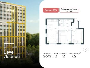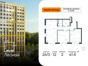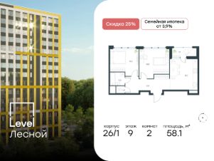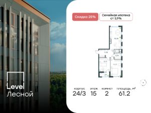 Цена указана с учётом скидки при 100%-й оплате, несубсидированной ипотеке, рассрочке (кроме программы ''Рассрочка 0%''). Субсидированная семейная ипотека. Полная стоимость кредита 20,963 - 23,237% годовых. Ставка 3,9% годовых. Первоначальный взнос от 20,01%. Сумма кредита до 12 млн. руб.В районе, утопающем в густой зелени лесов, многочисленных парков и скверов, продаётся 2-комнатная квартира площадью 61.40 кв.м без отделки. Квартира расположена на 12 этаже в жилом комплексе комфорт-класса Level Лесной (компания Level Group/Левел групп). Отличная транспортная доступность:- 25 мин. пешком до станции метро ''Пятницкое шоссе'',- 28 мин. на автобусе до станции метро и МЦД-2 ''Волоколамская'',- 11 мин. на авто до МКАД,- 25 мин. на авто до ТТК. Продуманный архитектурный проект:- Концепция проекта Level Лесной от бюро СПИЧ,- Высотность комплекса до 15 этажей с уникальными видами на лесные массивы и город, - Высота потолков до 3 м,- Современные окна высотой до 1,6 м, в части квартир предусмотрены окна в пол. Высота подоконников 0,6 м, Расположение:Level Лесной строится в зелёной зоне ближайшего Подмосковья, г.о. Красногорск в посёлке Отрадное. Шаговая и автомобильная доступность до метро и больших транспортных артерий города. За 25 минут вы дойдёте до станции метро ''Пятницкое шоссе'', а за 20 минут на машине сможете доехать до станции метро ''Тушинская''. Район окружен роскошной зеленью лесов и парковых зон, занимающих территорию свыше 1 000 гектаров. Помимо благоприятной экологии, здесь множество возможностей для активного отдыха и поддержания физической формы. Облагороженная территории с полностью развитой инфраструктурой. На территории проекта находится детский сад и школа ''Светлые Горы'', которая входит в список лучших частных школ от Forbes Education (по данным на 2023г.). Кроме того, в пешей доступности расположено ещё 8 детских садов, а также запланировано открытие современной муниципальной школы. В непосредственной близости находятся сетевые супермаркеты и локальные магазины, аптеки, клиники, почта, библиотека, салоны красоты, рестораны, спортивные и творческие секции, развивающие детские центры. В 12 минутах пешком расположен торговый парк ''Отрада'' с продуктовым и строительным гипермаркетами, магазинами, кинотеатром и развлечениями для детей. Внутренняя инфраструктура:Мы знаем, как важно, чтобы магазины и сервисы были всегда рядом. В сданных корпусах Level Лесной уже расположена полностью готовая развитая инфраструктура. На первых этажах корпуса 27 предусмотрено ещё 14 коммерческих помещений. Благоустройство:Продуманное пространство и аура приватного европейского городка рождают чувство лёгкости и расслабления у каждого, кто попадает на территорию проекта. Концепцию общественных площадок разработали в партнёрстве два архитектурных бюро: Highlight Architecture и SCAPE. В безопасных дворах без машин каждый обязательно найдёт себе место для вдохновения, отдыха и спорта.
