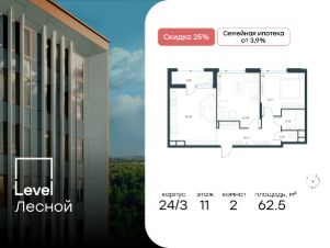 Цена указана с учётом скидки при 100%-й оплате, несубсидированной ипотеке, рассрочке (кроме программы ''Рассрочка 0%''). Субсидированная семейная ипотека. Полная стоимость кредита 20,963 - 23,237% годовых. Ставка 3,9% годовых. Первоначальный взнос от 20,01%. Сумма кредита до 12 млн. руб.В районе, утопающем в густой зелени лесов, многочисленных парков и скверов, продаётся 2-комнатная квартира площадью 62.30 кв.м с отделкой white box. Квартира расположена на 15 этаже в жилом комплексе комфорт-класса Level Лесной (компания Level Group/Левел групп). Отличная транспортная доступность- 25 мин. пешком до станции метро ''Пятницкое шоссе'',- 28 мин. на общественном транспорте до станции метро и МЦД-2 ''Волоколамская'',- 11 мин. на авто до МКАД,- 25 мин. на авто до ТТК.Продуманный архитектурный проект- Концепция проекта Level Лесной от бюро СПИЧ,- Высотность комплекса до 15 этажей с уникальными видами на лесные массивы и город,- Высота потолков до 3 м,- Современные окна высотой до 1,6 м, в части квартир предусмотрены окна в пол. Высота подоконников 0,6 м,РасположениеLevel Лесной строится в зелёной зоне ближайшего Подмосковья, г.о. Красногорск в посёлке Отрадное. Шаговая и автомобильная доступность до метро и больших транспортных артерий города. За 25 минут вы дойдёте до станции метро ''Пятницкое шоссе'' - одной из самых свободных станций Арбатско-Покровской линии, а за 20 минут на машине сможете доехать до станции метро ''Тушинская''. Район окружен роскошной зеленью лесов и парковых зон, занимающих территорию свыше 1 000 гектаров. Помимо благоприятной экологии, здесь множество возможностей для активного отдыха и поддержания физической формы. Облагороженная территории с полностью развитой инфраструктурой. На территории проекта находится детский сад и школа ''Светлые Горы'', которая входит в список лучших частных школ от Forbes Education (по данным на 2023г.). Кроме того, в пешей доступности расположено ещё 8 детских садов, а также запланировано открытие современной муниципальной школы. В непосредственной близости находятся сетевые супермаркеты и локальные магазины, аптеки, клиники, почта, библиотека, салоны красоты, рестораны, спортивные и творческие секции, развивающие детские центры. В 12 минутах пешком расположен торговый парк ''Отрада'' с продуктовым и строительным гипермаркетами, магазинами, кинотеатром и развлечениями для детей.Внутренняя инфраструктураМы знаем, как важно, чтобы магазины и сервисы были всегда рядом. В сданных корпусах Level Лесной уже расположена полностью готовая развитая инфраструктура. На первых этажах корпуса 27 предусмотрено ещё 14 коммерческих помещений.БлагоустройствоПродуманное пространство и аура приватного европейского городка рождают чувство лёгкости и расслабления у каждого, кто попадает на территорию проекта. Концепцию общественных площадок разработали в партнёрстве два архитектурных бюро: Highlight Architecture и SCAPE. В безопасных дворах без машин каждый обязательно найдёт себе место для вд
