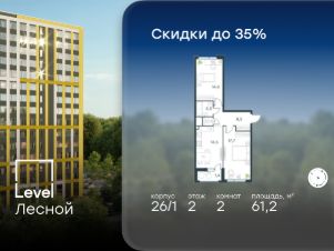 Цена указана с учётом скидки при 100%-й оплате, несубсидированной ипотеке, рассрочке (кроме программы ''Рассрочка 0%'').В районе, утопающем в густой зелени лесов, многочисленных парков и скверов, продаётся 2-комнатная квартира площадью 61.20 кв.м с отделкой white box. Квартира расположена на 2 этаже в жилом комплексе комфорт-класса Level Лесной (компания Level Group/Левел групп). Отличная транспортная доступность:- 25 мин. пешком до станции метро ''Пятницкое шоссе'',- 28 мин. на автобусе до станции метро и МЦД-2 ''Волоколамская'',- 11 мин. на авто до МКАД,- 25 мин. на авто до ТТК. Продуманный архитектурный проект:- Концепция проекта Level Лесной от бюро СПИЧ,- Высотность комплекса до 15 этажей с уникальными видами на лесные массивы и город, - Высота потолков до 3 м,- Современные окна высотой до 1,6 м, в части квартир предусмотрены окна в пол. Высота подоконников 0,6 м, Расположение:Level Лесной строится в зелёной зоне ближайшего Подмосковья, г.о. Красногорск в посёлке Отрадное. Шаговая и автомобильная доступность до метро и больших транспортных артерий города. За 25 минут вы дойдёте до станции метро ''Пятницкое шоссе'', а за 20 минут на машине сможете доехать до станции метро ''Тушинская''. Район окружен роскошной зеленью лесов и парковых зон, занимающих территорию свыше 1 000 гектаров. Помимо благоприятной экологии, здесь множество возможностей для активного отдыха и поддержания физической формы. Облагороженная территории с полностью развитой инфраструктурой. На территории проекта находится детский сад и школа ''Светлые Горы'', которая входит в список лучших частных школ от Forbes Education (по данным на 2023г.). Кроме того, в пешей доступности расположено ещё 8 детских садов, а также запланировано открытие современной муниципальной школы. В непосредственной близости находятся сетевые супермаркеты и локальные магазины, аптеки, клиники, почта, библиотека, салоны красоты, рестораны, спортивные и творческие секции, развивающие детские центры. В 12 минутах пешком расположен торговый парк ''Отрада'' с продуктовым и строительным гипермаркетами, магазинами, кинотеатром и развлечениями для детей. Внутренняя инфраструктура:Мы знаем, как важно, чтобы магазины и сервисы были всегда рядом. В сданных корпусах Level Лесной уже расположена полностью готовая развитая инфраструктура. На первых этажах корпуса 27 предусмотрено ещё 14 коммерческих помещений. Благоустройство:Продуманное пространство и аура приватного европейского городка рождают чувство лёгкости и расслабления у каждого, кто попадает на территорию проекта. Концепцию общественных площадок разработали в партнёрстве два архитектурных бюро: Highlight Architecture и SCAPE. В безопасных дворах без машин каждый обязательно найдёт себе место для вдохновения, отдыха и спорта.