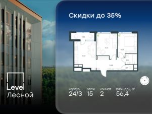 Цена указана с учётом скидки при 100%-й оплате, несубсидированной ипотеке, рассрочке (кроме программы ''Рассрочка 0%'').В районе, утопающем в густой зелени лесов, многочисленных парков и скверов, продаётся 2-комнатная квартира площадью 56.40 кв.м с отделкой white box. Квартира расположена на 15 этаже в жилом комплексе комфорт-класса Level Лесной (компания Level Group/Левел групп). Отличная транспортная доступность:- 25 мин. пешком до станции метро ''Пятницкое шоссе'',- 28 мин. на автобусе до станции метро и МЦД-2 ''Волоколамская'',- 11 мин. на авто до МКАД,- 25 мин. на авто до ТТК. Продуманный архитектурный проект:- Концепция проекта Level Лесной от бюро СПИЧ,- Высотность комплекса до 15 этажей с уникальными видами на лесные массивы и город, - Высота потолков до 3 м,- Современные окна высотой до 1,6 м, в части квартир предусмотрены окна в пол. Высота подоконников 0,6 м, Расположение:Level Лесной строится в зелёной зоне ближайшего Подмосковья, г.о. Красногорск в посёлке Отрадное. Шаговая и автомобильная доступность до метро и больших транспортных артерий города. За 25 минут вы дойдёте до станции метро ''Пятницкое шоссе'', а за 20 минут на машине сможете доехать до станции метро ''Тушинская''. Район окружен роскошной зеленью лесов и парковых зон, занимающих территорию свыше 1 000 гектаров. Помимо благоприятной экологии, здесь множество возможностей для активного отдыха и поддержания физической формы. Облагороженная территории с полностью развитой инфраструктурой. На территории проекта находится детский сад и школа ''Светлые Горы'', которая входит в список лучших частных школ от Forbes Education (по данным на 2023г.). Кроме того, в пешей доступности расположено ещё 8 детских садов, а также запланировано открытие современной муниципальной школы. В непосредственной близости находятся сетевые супермаркеты и локальные магазины, аптеки, клиники, почта, библиотека, салоны красоты, рестораны, спортивные и творческие секции, развивающие детские центры. В 12 минутах пешком расположен торговый парк ''Отрада'' с продуктовым и строительным гипермаркетами, магазинами, кинотеатром и развлечениями для детей. Внутренняя инфраструктура:Мы знаем, как важно, чтобы магазины и сервисы были всегда рядом. В сданных корпусах Level Лесной уже расположена полностью готовая развитая инфраструктура. На первых этажах корпуса 27 предусмотрено ещё 14 коммерческих помещений. Благоустройство:Продуманное пространство и аура приватного европейского городка рождают чувство лёгкости и расслабления у каждого, кто попадает на территорию проекта. Концепцию общественных площадок разработали в партнёрстве два архитектурных бюро: Highlight Architecture и SCAPE. В безопасных дворах без машин каждый обязательно найдёт себе место для вдохновения, отдыха и спорта.