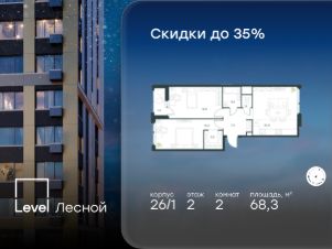 Цена указана с учётом скидки при 100%-й оплате, несубсидированной ипотеке, рассрочке (кроме программы ''Рассрочка 0%'').В районе, утопающем в густой зелени лесов, многочисленных парков и скверов, продаётся 2-комнатная квартира площадью 68.30 кв.м с отделкой white box. Квартира расположена на 2 этаже в жилом комплексе комфорт-класса Level Лесной (компания Level Group/Левел групп). Отличная транспортная доступность:- 25 мин. пешком до станции метро ''Пятницкое шоссе'',- 28 мин. на автобусе до станции метро и МЦД-2 ''Волоколамская'',- 11 мин. на авто до МКАД,- 25 мин. на авто до ТТК. Продуманный архитектурный проект:- Концепция проекта Level Лесной от бюро СПИЧ,- Высотность комплекса до 15 этажей с уникальными видами на лесные массивы и город, - Высота потолков до 3 м,- Современные окна высотой до 1,6 м, в части квартир предусмотрены окна в пол. Высота подоконников 0,6 м, Расположение:Level Лесной строится в зелёной зоне ближайшего Подмосковья, г.о. Красногорск в посёлке Отрадное. Шаговая и автомобильная доступность до метро и больших транспортных артерий города. За 25 минут вы дойдёте до станции метро ''Пятницкое шоссе'', а за 20 минут на машине сможете доехать до станции метро ''Тушинская''. Район окружен роскошной зеленью лесов и парковых зон, занимающих территорию свыше 1 000 гектаров. Помимо благоприятной экологии, здесь множество возможностей для активного отдыха и поддержания физической формы. Облагороженная территории с полностью развитой инфраструктурой. На территории проекта находится детский сад и школа ''Светлые Горы'', которая входит в список лучших частных школ от Forbes Education (по данным на 2023г.). Кроме того, в пешей доступности расположено ещё 8 детских садов, а также запланировано открытие современной муниципальной школы. В непосредственной близости находятся сетевые супермаркеты и локальные магазины, аптеки, клиники, почта, библиотека, салоны красоты, рестораны, спортивные и творческие секции, развивающие детские центры. В 12 минутах пешком расположен торговый парк ''Отрада'' с продуктовым и строительным гипермаркетами, магазинами, кинотеатром и развлечениями для детей. Внутренняя инфраструктура:Мы знаем, как важно, чтобы магазины и сервисы были всегда рядом. В сданных корпусах Level Лесной уже расположена полностью готовая развитая инфраструктура. На первых этажах корпуса 27 предусмотрено ещё 14 коммерческих помещений. Благоустройство:Продуманное пространство и аура приватного европейского городка рождают чувство лёгкости и расслабления у каждого, кто попадает на территорию проекта. Концепцию общественных площадок разработали в партнёрстве два архитектурных бюро: Highlight Architecture и SCAPE. В безопасных дворах без машин каждый обязательно найдёт себе место для вдохновения, отдыха и спорта.
