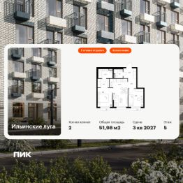 Продаётся 2-комн. квартира площадью 51,98 кв.м на 5 этаже 9 этажного дома (Корпус 4.1, Секция 5) проекта ПИК Ильинские луга. Светлый просторный подъезд на уровне земли, функциональная планировка, большие окна, c отделкой. Жилой район ''Ильинские луга'' находится в 10 километрах от МКАД по Новорижскому шоссе, в 20 минутах на автомобиле от станций метро ''Волоколамская'', ''Тушинская'' и ''Строгино''. В будущем ближе к проекту, в 9 минутах пути на машине, откроется станция ''Ильинская'' Рублёво-Архангельской линии, которая будет соединять Арбатско-Покровскую линию и Большую кольцевую линию.Сейчас в квартале начались продажи в корпусах 3.2, 3.3, 3.4, 3.5 и 3.6.''Ильинские луга'' — масштабный проект, в который входит девять детских садов, четыре школы и поликлиника. Он строится в престижном и экологичном районе среди лесов и памятников природы. За 5 минут от жилого квартала можно доехать до Рублёво-Успенского шоссе, а за 30 минут — до центра Москвы. До крупного торгового центра ''РИГАМОЛЛ'' всего 5 минут на автомобиле, а до ТЦ ''Твой дом'' и гипермаркета ''Глобус'' — 10 минут.В ''Ильинских лугах'' строятся только девятиэтажные дома — такая архитектура соответствует спокойной жизни за городом. В каждом дворе-парке есть места для отдыха, детские и спортивные площадки. А ещё, здесь уже открыт большой PlayHub ''Гравити'' — современное игровое пространство с космической тематикой, холмами, зонами для игр и отдыха жителей любого возраста.На первых этажах уже работают магазины, кафе и пекарни.Места для отдыха от ''Ильинских лугов'' тоже недалеко: 10 минут на машине — и вы в музее-усадьбе ''Архангельское''. Также рядом находится Лохин остров — памятник природы, где водятся речные черепахи, есть места для кемпинга и возможность сплавиться по реке. Артикул 1016186 (Застройщик ООО ''СЗ ''ГРАДОЛИМП'')
