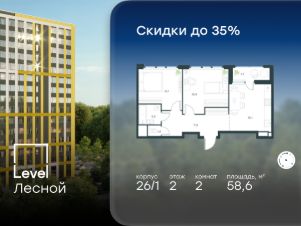 Цена указана с учётом скидки при 100%-й оплате, несубсидированной ипотеке, рассрочке (кроме программы ''Рассрочка 0%'').В районе, утопающем в густой зелени лесов, многочисленных парков и скверов, продаётся 2-комнатная квартира площадью 58.60 кв.м с отделкой white box. Квартира расположена на 2 этаже в жилом комплексе комфорт-класса Level Лесной (компания Level Group/Левел групп). Отличная транспортная доступность:- 25 мин. пешком до станции метро ''Пятницкое шоссе'',- 28 мин. на автобусе до станции метро и МЦД-2 ''Волоколамская'',- 11 мин. на авто до МКАД,- 25 мин. на авто до ТТК. Продуманный архитектурный проект:- Концепция проекта Level Лесной от бюро СПИЧ,- Высотность комплекса до 15 этажей с уникальными видами на лесные массивы и город, - Высота потолков до 3 м,- Современные окна высотой до 1,6 м, в части квартир предусмотрены окна в пол. Высота подоконников 0,6 м, Расположение:Level Лесной строится в зелёной зоне ближайшего Подмосковья, г.о. Красногорск в посёлке Отрадное. Шаговая и автомобильная доступность до метро и больших транспортных артерий города. За 25 минут вы дойдёте до станции метро ''Пятницкое шоссе'', а за 20 минут на машине сможете доехать до станции метро ''Тушинская''. Район окружен роскошной зеленью лесов и парковых зон, занимающих территорию свыше 1 000 гектаров. Помимо благоприятной экологии, здесь множество возможностей для активного отдыха и поддержания физической формы. Облагороженная территории с полностью развитой инфраструктурой. На территории проекта находится детский сад и школа ''Светлые Горы'', которая входит в список лучших частных школ от Forbes Education (по данным на 2023г.). Кроме того, в пешей доступности расположено ещё 8 детских садов, а также запланировано открытие современной муниципальной школы. В непосредственной близости находятся сетевые супермаркеты и локальные магазины, аптеки, клиники, почта, библиотека, салоны красоты, рестораны, спортивные и творческие секции, развивающие детские центры. В 12 минутах пешком расположен торговый парк ''Отрада'' с продуктовым и строительным гипермаркетами, магазинами, кинотеатром и развлечениями для детей. Внутренняя инфраструктура:Мы знаем, как важно, чтобы магазины и сервисы были всегда рядом. В сданных корпусах Level Лесной уже расположена полностью готовая развитая инфраструктура. На первых этажах корпуса 27 предусмотрено ещё 14 коммерческих помещений. Благоустройство:Продуманное пространство и аура приватного европейского городка рождают чувство лёгкости и расслабления у каждого, кто попадает на территорию проекта. Концепцию общественных площадок разработали в партнёрстве два архитектурных бюро: Highlight Architecture и SCAPE. В безопасных дворах без машин каждый обязательно найдёт себе место для вдохновения, отдыха и спорта.