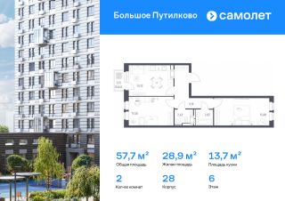 Строим кварталы для жизни с заботой о будущем. Предлагается 2-комнатная квартира комфорт-класса 57,74 кв.м в корпусе 28 на 6 этаже, в ЖК ''Большое Путилково''Квартира с чистовой отделкой. Доступность дополнительных опций уточняйте у застройщика.Приобрести квартиру возможно по специальным акциям от застройщика, с текущими условиями акций можно ознакомиться в блоке ''Акций''.Цена динамическая и может отличаться, уточняйте актуальность у застройщика.''Большое Путилково'' — масштабный жилой комплекс рядом с Алешкинским и Новогорским лесопарками. Мы уже построили и открыли 3 детских сада и школу, на первых этажах корпусов работают магазины, аптеки, кафе и пекарни. Удобное расположение проекта позволяет всего за 10 минут добраться до 4 станций метро.Во дворах обустроены детские площадки и зоны для отдыха. Все квартиры сдаются с готовой отделкой - переезжайте сразу после получения ключей!