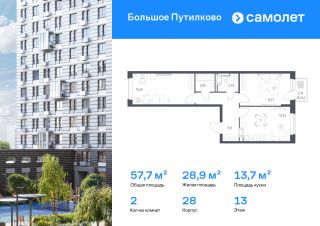 Строим кварталы для жизни с заботой о будущем. Предлагается 2-комнатная квартира комфорт-класса 57,68 кв.м в корпусе 28 на 13 этаже, в ЖК ''Большое Путилково''Квартира без отделки. Доступность опции ''отделка'' и возможность комплектации мебелью и декором уточняйте у застройщика.Приобрести квартиру возможно по специальным акциям от застройщика, с текущими условиями акций можно ознакомиться в блоке ''Акций''.Цена динамическая и может отличаться, уточняйте актуальность у застройщика.''Большое Путилково'' — масштабный жилой комплекс рядом с Алешкинским и Новогорским лесопарками. Мы уже построили и открыли 3 детских сада и школу, на первых этажах корпусов работают магазины, аптеки, кафе и пекарни. Удобное расположение проекта позволяет всего за 10 минут добраться до 4 станций метро.Во дворах обустроены детские площадки и зоны для отдыха. Все квартиры сдаются с готовой отделкой - переезжайте сразу после получения ключей!