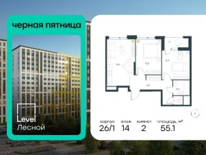 Цена указана с учётом скидки при 100%-й оплате, несубсидированной ипотеке, рассрочке (кроме программы ''Рассрочка 0%''). Субсидированная семейная ипотека. Полная стоимость кредита 20,963 - 23,237% годовых. Ставка 3,9% годовых. Первоначальный взнос от 20,01%. Сумма кредита до 12 млн. руб.В районе, утопающем в густой зелени лесов, многочисленных парков и скверов, продаётся 2-комнатная квартира площадью 55.10 кв.м с отделкой white box. Квартира расположена на 14 этаже в жилом комплексе комфорт-класса Level Лесной (компания Level Group/Левел групп). Отличная транспортная доступность:- 25 мин. пешком до станции метро ''Пятницкое шоссе'',- 28 мин. на автобусе до станции метро и МЦД-2 ''Волоколамская'',- 11 мин. на авто до МКАД,- 25 мин. на авто до ТТК. Продуманный архитектурный проект:- Концепция проекта Level Лесной от бюро СПИЧ,- Высотность комплекса до 15 этажей с уникальными видами на лесные массивы и город, - Высота потолков до 3 м,- Современные окна высотой до 1,6 м, в части квартир предусмотрены окна в пол. Высота подоконников 0,6 м, Расположение:Level Лесной строится в зелёной зоне ближайшего Подмосковья, г.о. Красногорск в посёлке Отрадное. Шаговая и автомобильная доступность до метро и больших транспортных артерий города. За 25 минут вы дойдёте до станции метро ''Пятницкое шоссе'', а за 20 минут на машине сможете доехать до станции метро ''Тушинская''. Район окружен роскошной зеленью лесов и парковых зон, занимающих территорию свыше 1 000 гектаров. Помимо благоприятной экологии, здесь множество возможностей для активного отдыха и поддержания физической формы. Облагороженная территории с полностью развитой инфраструктурой. На территории проекта находится детский сад и школа ''Светлые Горы'', которая входит в список лучших частных школ от Forbes Education (по данным на 2023г.). Кроме того, в пешей доступности расположено ещё 8 детских садов, а также запланировано открытие современной муниципальной школы. В непосредственной близости находятся сетевые супермаркеты и локальные магазины, аптеки, клиники, почта, библиотека, салоны красоты, рестораны, спортивные и творческие секции, развивающие детские центры. В 12 минутах пешком расположен торговый парк ''Отрада'' с продуктовым и строительным гипермаркетами, магазинами, кинотеатром и развлечениями для детей. Внутренняя инфраструктура:Мы знаем, как важно, чтобы магазины и сервисы были всегда рядом. В сданных корпусах Level Лесной уже расположена полностью готовая развитая инфраструктура. На первых этажах корпуса 27 предусмотрено ещё 14 коммерческих помещений. Благоустройство:Продуманное пространство и аура приватного европейского городка рождают чувство лёгкости и расслабления у каждого, кто попадает на территорию проекта. Концепцию общественных площадок разработали в партнёрстве два архитектурных бюро: Highlight Architecture и SCAPE. В безопасных дворах без машин каждый обязательно найдёт себе место для вдохновения, отдыха и спорта.