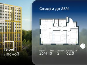 Цена указана с учётом скидки при 100%-й оплате, несубсидированной ипотеке, рассрочке (кроме программы ''Рассрочка 0%'').В районе, утопающем в густой зелени лесов, многочисленных парков и скверов, продаётся 2-комнатная квартира площадью 62.30 кв.м с отделкой white box. Квартира расположена на 3 этаже в жилом комплексе комфорт-класса Level Лесной (компания Level Group/Левел групп). Отличная транспортная доступность:- 25 мин. пешком до станции метро ''Пятницкое шоссе'',- 28 мин. на автобусе до станции метро и МЦД-2 ''Волоколамская'',- 11 мин. на авто до МКАД,- 25 мин. на авто до ТТК. Продуманный архитектурный проект:- Концепция проекта Level Лесной от бюро СПИЧ,- Высотность комплекса до 15 этажей с уникальными видами на лесные массивы и город, - Высота потолков до 3 м,- Современные окна высотой до 1,6 м, в части квартир предусмотрены окна в пол. Высота подоконников 0,6 м, Расположение:Level Лесной строится в зелёной зоне ближайшего Подмосковья, г.о. Красногорск в посёлке Отрадное. Шаговая и автомобильная доступность до метро и больших транспортных артерий города. За 25 минут вы дойдёте до станции метро ''Пятницкое шоссе'', а за 20 минут на машине сможете доехать до станции метро ''Тушинская''. Район окружен роскошной зеленью лесов и парковых зон, занимающих территорию свыше 1 000 гектаров. Помимо благоприятной экологии, здесь множество возможностей для активного отдыха и поддержания физической формы. Облагороженная территории с полностью развитой инфраструктурой. На территории проекта находится детский сад и школа ''Светлые Горы'', которая входит в список лучших частных школ от Forbes Education (по данным на 2023г.). Кроме того, в пешей доступности расположено ещё 8 детских садов, а также запланировано открытие современной муниципальной школы. В непосредственной близости находятся сетевые супермаркеты и локальные магазины, аптеки, клиники, почта, библиотека, салоны красоты, рестораны, спортивные и творческие секции, развивающие детские центры. В 12 минутах пешком расположен торговый парк ''Отрада'' с продуктовым и строительным гипермаркетами, магазинами, кинотеатром и развлечениями для детей. Внутренняя инфраструктура:Мы знаем, как важно, чтобы магазины и сервисы были всегда рядом. В сданных корпусах Level Лесной уже расположена полностью готовая развитая инфраструктура. На первых этажах корпуса 27 предусмотрено ещё 14 коммерческих помещений. Благоустройство:Продуманное пространство и аура приватного европейского городка рождают чувство лёгкости и расслабления у каждого, кто попадает на территорию проекта. Концепцию общественных площадок разработали в партнёрстве два архитектурных бюро: Highlight Architecture и SCAPE. В безопасных дворах без машин каждый обязательно найдёт себе место для вдохновения, отдыха и спорта.