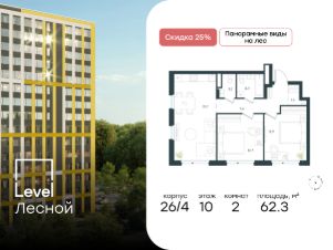 Цена указана с учётом скидкиВ районе, утопающем в густой зелени лесов, многочисленных парков и скверов, продаётся 2-комнатная квартира площадью 62.30 кв.м с отделкой white box. Квартира расположена на 10 этаже в жилом комплексе комфорт-класса Level Лесной (компания Level Group/Левел групп). Отличная транспортная доступность- 25 мин. пешком до станции метро ''Пятницкое шоссе'',- 28 мин. на общественном транспорте до станции метро и МЦД-2 ''Волоколамская'',- 11 мин. на авто до МКАД,- 25 мин. на авто до ТТК.Продуманный архитектурный проект- Концепция проекта Level Лесной от бюро СПИЧ,- Высотность комплекса до 15 этажей с уникальными видами на лесные массивы и город,- Высота потолков до 3 м,- Современные окна высотой до 1,6 м, в части квартир предусмотрены окна в пол. Высота подоконников 0,6 м,РасположениеLevel Лесной строится в зелёной зоне ближайшего Подмосковья, г.о. Красногорск в посёлке Отрадное. Шаговая и автомобильная доступность до метро и больших транспортных артерий города. За 25 минут вы дойдёте до станции метро ''Пятницкое шоссе'' - одной из самых свободных станций Арбатско-Покровской линии, а за 20 минут на машине сможете доехать до станции метро ''Тушинская''. Район окружен роскошной зеленью лесов и парковых зон, занимающих территорию свыше 1 000 гектаров. Помимо благоприятной экологии, здесь множество возможностей для активного отдыха и поддержания физической формы. Облагороженная территории с полностью развитой инфраструктурой. На территории проекта находится детский сад и школа ''Светлые Горы'', которая входит в список лучших частных школ от Forbes Education (по данным на 2023г.). Кроме того, в пешей доступности расположено ещё 8 детских садов, а также запланировано открытие современной муниципальной школы. В непосредственной близости находятся сетевые супермаркеты и локальные магазины, аптеки, клиники, почта, библиотека, салоны красоты, рестораны, спортивные и творческие секции, развивающие детские центры. В 12 минутах пешком расположен торговый парк ''Отрада'' с продуктовым и строительным гипермаркетами, магазинами, кинотеатром и развлечениями для детей.Внутренняя инфраструктураМы знаем, как важно, чтобы магазины и сервисы были всегда рядом. В сданных корпусах Level Лесной уже расположена полностью готовая развитая инфраструктура. На первых этажах корпуса 27 предусмотрено ещё 14 коммерческих помещений.БлагоустройствоПродуманное пространство и аура приватного европейского городка рождают чувство лёгкости и расслабления у каждого, кто попадает на территорию проекта. Концепцию общественных площадок разработали в партнёрстве два архитектурных бюро: Highlight Architecture и SCAPE. В безопасных дворах без машин каждый обязательно найдёт себе место для вдохновения, отдыха и спорта.