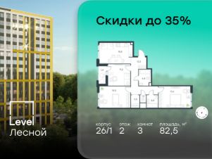 Цена указана с учётом скидки при 100%-й оплате, несубсидированной ипотеке, рассрочке (кроме программы ''Рассрочка 0%'').В районе, утопающем в густой зелени лесов, многочисленных парков и скверов, продаётся 3-комнатная квартира площадью 82.50 кв.м с отделкой white box. Квартира расположена на 2 этаже в жилом комплексе комфорт-класса Level Лесной (компания Level Group/Левел групп). Отличная транспортная доступность:- 25 мин. пешком до станции метро ''Пятницкое шоссе'',- 28 мин. на автобусе до станции метро и МЦД-2 ''Волоколамская'',- 11 мин. на авто до МКАД,- 25 мин. на авто до ТТК. Продуманный архитектурный проект:- Концепция проекта Level Лесной от бюро СПИЧ,- Высотность комплекса до 15 этажей с уникальными видами на лесные массивы и город, - Высота потолков до 3 м,- Современные окна высотой до 1,6 м, в части квартир предусмотрены окна в пол. Высота подоконников 0,6 м, Расположение:Level Лесной строится в зелёной зоне ближайшего Подмосковья, г.о. Красногорск в посёлке Отрадное. Шаговая и автомобильная доступность до метро и больших транспортных артерий города. За 25 минут вы дойдёте до станции метро ''Пятницкое шоссе'', а за 20 минут на машине сможете доехать до станции метро ''Тушинская''. Район окружен роскошной зеленью лесов и парковых зон, занимающих территорию свыше 1 000 гектаров. Помимо благоприятной экологии, здесь множество возможностей для активного отдыха и поддержания физической формы. Облагороженная территории с полностью развитой инфраструктурой. На территории проекта находится детский сад и школа ''Светлые Горы'', которая входит в список лучших частных школ от Forbes Education (по данным на 2023г.). Кроме того, в пешей доступности расположено ещё 8 детских садов, а также запланировано открытие современной муниципальной школы. В непосредственной близости находятся сетевые супермаркеты и локальные магазины, аптеки, клиники, почта, библиотека, салоны красоты, рестораны, спортивные и творческие секции, развивающие детские центры. В 12 минутах пешком расположен торговый парк ''Отрада'' с продуктовым и строительным гипермаркетами, магазинами, кинотеатром и развлечениями для детей. Внутренняя инфраструктура:Мы знаем, как важно, чтобы магазины и сервисы были всегда рядом. В сданных корпусах Level Лесной уже расположена полностью готовая развитая инфраструктура. На первых этажах корпуса 27 предусмотрено ещё 14 коммерческих помещений. Благоустройство:Продуманное пространство и аура приватного европейского городка рождают чувство лёгкости и расслабления у каждого, кто попадает на территорию проекта. Концепцию общественных площадок разработали в партнёрстве два архитектурных бюро: Highlight Architecture и SCAPE. В безопасных дворах без машин каждый обязательно найдёт себе место для вдохновения, отдыха и спорта.