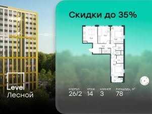 Цена указана с учётом скидки при 100%-й оплате, несубсидированной ипотеке, рассрочке (кроме программы ''Рассрочка 0%'').В районе, утопающем в густой зелени лесов, многочисленных парков и скверов, продаётся 3-комнатная квартира площадью 78.00 кв.м без отделки. Квартира расположена на 14 этаже в жилом комплексе комфорт-класса Level Лесной (компания Level Group/Левел групп). Отличная транспортная доступность:- 25 мин. пешком до станции метро ''Пятницкое шоссе'',- 28 мин. на автобусе до станции метро и МЦД-2 ''Волоколамская'',- 11 мин. на авто до МКАД,- 25 мин. на авто до ТТК. Продуманный архитектурный проект:- Концепция проекта Level Лесной от бюро СПИЧ,- Высотность комплекса до 15 этажей с уникальными видами на лесные массивы и город, - Высота потолков до 3 м,- Современные окна высотой до 1,6 м, в части квартир предусмотрены окна в пол. Высота подоконников 0,6 м, Расположение:Level Лесной строится в зелёной зоне ближайшего Подмосковья, г.о. Красногорск в посёлке Отрадное. Шаговая и автомобильная доступность до метро и больших транспортных артерий города. За 25 минут вы дойдёте до станции метро ''Пятницкое шоссе'', а за 20 минут на машине сможете доехать до станции метро ''Тушинская''. Район окружен роскошной зеленью лесов и парковых зон, занимающих территорию свыше 1 000 гектаров. Помимо благоприятной экологии, здесь множество возможностей для активного отдыха и поддержания физической формы. Облагороженная территории с полностью развитой инфраструктурой. На территории проекта находится детский сад и школа ''Светлые Горы'', которая входит в список лучших частных школ от Forbes Education (по данным на 2023г.). Кроме того, в пешей доступности расположено ещё 8 детских садов, а также запланировано открытие современной муниципальной школы. В непосредственной близости находятся сетевые супермаркеты и локальные магазины, аптеки, клиники, почта, библиотека, салоны красоты, рестораны, спортивные и творческие секции, развивающие детские центры. В 12 минутах пешком расположен торговый парк ''Отрада'' с продуктовым и строительным гипермаркетами, магазинами, кинотеатром и развлечениями для детей. Внутренняя инфраструктура:Мы знаем, как важно, чтобы магазины и сервисы были всегда рядом. В сданных корпусах Level Лесной уже расположена полностью готовая развитая инфраструктура. На первых этажах корпуса 27 предусмотрено ещё 14 коммерческих помещений. Благоустройство:Продуманное пространство и аура приватного европейского городка рождают чувство лёгкости и расслабления у каждого, кто попадает на территорию проекта. Концепцию общественных площадок разработали в партнёрстве два архитектурных бюро: Highlight Architecture и SCAPE. В безопасных дворах без машин каждый обязательно найдёт себе место для вдохновения, отдыха и спорта.