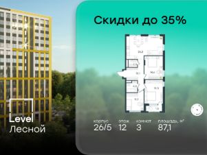 Цена указана с учётом скидки при 100%-й оплате, несубсидированной ипотеке, рассрочке (кроме программы ''Рассрочка 0%'').В районе, утопающем в густой зелени лесов, многочисленных парков и скверов, продаётся 3-комнатная квартира площадью 87.10 кв.м с отделкой white box. Квартира расположена на 12 этаже в жилом комплексе комфорт-класса Level Лесной (компания Level Group/Левел групп). Отличная транспортная доступность:- 25 мин. пешком до станции метро ''Пятницкое шоссе'',- 28 мин. на автобусе до станции метро и МЦД-2 ''Волоколамская'',- 11 мин. на авто до МКАД,- 25 мин. на авто до ТТК. Продуманный архитектурный проект:- Концепция проекта Level Лесной от бюро СПИЧ,- Высотность комплекса до 15 этажей с уникальными видами на лесные массивы и город, - Высота потолков до 3 м,- Современные окна высотой до 1,6 м, в части квартир предусмотрены окна в пол. Высота подоконников 0,6 м, Расположение:Level Лесной строится в зелёной зоне ближайшего Подмосковья, г.о. Красногорск в посёлке Отрадное. Шаговая и автомобильная доступность до метро и больших транспортных артерий города. За 25 минут вы дойдёте до станции метро ''Пятницкое шоссе'', а за 20 минут на машине сможете доехать до станции метро ''Тушинская''. Район окружен роскошной зеленью лесов и парковых зон, занимающих территорию свыше 1 000 гектаров. Помимо благоприятной экологии, здесь множество возможностей для активного отдыха и поддержания физической формы. Облагороженная территории с полностью развитой инфраструктурой. На территории проекта находится детский сад и школа ''Светлые Горы'', которая входит в список лучших частных школ от Forbes Education (по данным на 2023г.). Кроме того, в пешей доступности расположено ещё 8 детских садов, а также запланировано открытие современной муниципальной школы. В непосредственной близости находятся сетевые супермаркеты и локальные магазины, аптеки, клиники, почта, библиотека, салоны красоты, рестораны, спортивные и творческие секции, развивающие детские центры. В 12 минутах пешком расположен торговый парк ''Отрада'' с продуктовым и строительным гипермаркетами, магазинами, кинотеатром и развлечениями для детей. Внутренняя инфраструктура:Мы знаем, как важно, чтобы магазины и сервисы были всегда рядом. В сданных корпусах Level Лесной уже расположена полностью готовая развитая инфраструктура. На первых этажах корпуса 27 предусмотрено ещё 14 коммерческих помещений. Благоустройство:Продуманное пространство и аура приватного европейского городка рождают чувство лёгкости и расслабления у каждого, кто попадает на территорию проекта. Концепцию общественных площадок разработали в партнёрстве два архитектурных бюро: Highlight Architecture и SCAPE. В безопасных дворах без машин каждый обязательно найдёт себе место для вдохновения, отдыха и спорта.