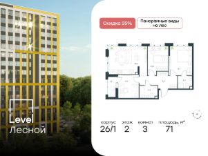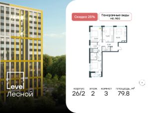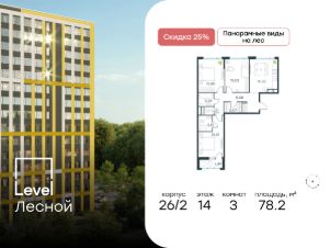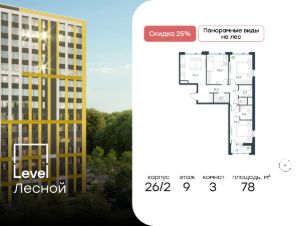 Цена указана с учётом скидкиВ районе, утопающем в густой зелени лесов, многочисленных парков и скверов, продаётся 3-комнатная квартира площадью 78.80 кв.м без отделки. Квартира расположена на 2 этаже в жилом комплексе комфорт-класса Level Лесной (компания Level Group/Левел групп). Отличная транспортная доступность- 25 мин. пешком до станции метро ''Пятницкое шоссе'',- 28 мин. на общественном транспорте до станции метро и МЦД-2 ''Волоколамская'',- 11 мин. на авто до МКАД,- 25 мин. на авто до ТТК.Продуманный архитектурный проект- Концепция проекта Level Лесной от бюро СПИЧ,- Высотность комплекса до 15 этажей с уникальными видами на лесные массивы и город,- Высота потолков до 3 м,- Современные окна высотой до 1,6 м, в части квартир предусмотрены окна в пол. Высота подоконников 0,6 м,РасположениеLevel Лесной строится в зелёной зоне ближайшего Подмосковья, г.о. Красногорск в посёлке Отрадное. Шаговая и автомобильная доступность до метро и больших транспортных артерий города. За 25 минут вы дойдёте до станции метро ''Пятницкое шоссе'' - одной из самых свободных станций Арбатско-Покровской линии, а за 20 минут на машине сможете доехать до станции метро ''Тушинская''. Район окружен роскошной зеленью лесов и парковых зон, занимающих территорию свыше 1 000 гектаров. Помимо благоприятной экологии, здесь множество возможностей для активного отдыха и поддержания физической формы. Облагороженная территории с полностью развитой инфраструктурой. На территории проекта находится детский сад и школа ''Светлые Горы'', которая входит в список лучших частных школ от Forbes Education (по данным на 2023г.). Кроме того, в пешей доступности расположено ещё 8 детских садов, а также запланировано открытие современной муниципальной школы. В непосредственной близости находятся сетевые супермаркеты и локальные магазины, аптеки, клиники, почта, библиотека, салоны красоты, рестораны, спортивные и творческие секции, развивающие детские центры. В 12 минутах пешком расположен торговый парк ''Отрада'' с продуктовым и строительным гипермаркетами, магазинами, кинотеатром и развлечениями для детей.Внутренняя инфраструктураМы знаем, как важно, чтобы магазины и сервисы были всегда рядом. В сданных корпусах Level Лесной уже расположена полностью готовая развитая инфраструктура. На первых этажах корпуса 27 предусмотрено ещё 14 коммерческих помещений.БлагоустройствоПродуманное пространство и аура приватного европейского городка рождают чувство лёгкости и расслабления у каждого, кто попадает на территорию проекта. Концепцию общественных площадок разработали в партнёрстве два архитектурных бюро: Highlight Architecture и SCAPE. В безопасных дворах без машин каждый обязательно найдёт себе место для вдохновения, отдыха и спорта.