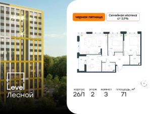 Цена указана с учётом скидки при 100%-й оплате, несубсидированной ипотеке, рассрочке (кроме программы ''Рассрочка 0%''). Субсидированная семейная ипотека. Полная стоимость кредита 20,963 - 23,237% годовых. Ставка 3,9% годовых. Первоначальный взнос от 20,01%. Сумма кредита до 12 млн. руб.В районе, утопающем в густой зелени лесов, многочисленных парков и скверов, продаётся 3-комнатная квартира площадью 71.00 кв.м с отделкой white box. Квартира расположена на 2 этаже в жилом комплексе комфорт-класса Level Лесной (компания Level Group/Левел групп). Отличная транспортная доступность:- 25 мин. пешком до станции метро ''Пятницкое шоссе'',- 28 мин. на автобусе до станции метро и МЦД-2 ''Волоколамская'',- 11 мин. на авто до МКАД,- 25 мин. на авто до ТТК. Продуманный архитектурный проект:- Концепция проекта Level Лесной от бюро СПИЧ,- Высотность комплекса до 15 этажей с уникальными видами на лесные массивы и город, - Высота потолков до 3 м,- Современные окна высотой до 1,6 м, в части квартир предусмотрены окна в пол. Высота подоконников 0,6 м, Расположение:Level Лесной строится в зелёной зоне ближайшего Подмосковья, г.о. Красногорск в посёлке Отрадное. Шаговая и автомобильная доступность до метро и больших транспортных артерий города. За 25 минут вы дойдёте до станции метро ''Пятницкое шоссе'', а за 20 минут на машине сможете доехать до станции метро ''Тушинская''. Район окружен роскошной зеленью лесов и парковых зон, занимающих территорию свыше 1 000 гектаров. Помимо благоприятной экологии, здесь множество возможностей для активного отдыха и поддержания физической формы. Облагороженная территории с полностью развитой инфраструктурой. На территории проекта находится детский сад и школа ''Светлые Горы'', которая входит в список лучших частных школ от Forbes Education (по данным на 2023г.). Кроме того, в пешей доступности расположено ещё 8 детских садов, а также запланировано открытие современной муниципальной школы. В непосредственной близости находятся сетевые супермаркеты и локальные магазины, аптеки, клиники, почта, библиотека, салоны красоты, рестораны, спортивные и творческие секции, развивающие детские центры. В 12 минутах пешком расположен торговый парк ''Отрада'' с продуктовым и строительным гипермаркетами, магазинами, кинотеатром и развлечениями для детей. Внутренняя инфраструктура:Мы знаем, как важно, чтобы магазины и сервисы были всегда рядом. В сданных корпусах Level Лесной уже расположена полностью готовая развитая инфраструктура. На первых этажах корпуса 27 предусмотрено ещё 14 коммерческих помещений. Благоустройство:Продуманное пространство и аура приватного европейского городка рождают чувство лёгкости и расслабления у каждого, кто попадает на территорию проекта. Концепцию общественных площадок разработали в партнёрстве два архитектурных бюро: Highlight Architecture и SCAPE. В безопасных дворах без машин каждый обязательно найдёт себе место для вдохновения, отдыха и спорта.