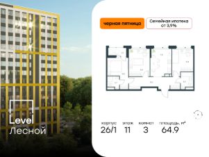 Цена указана с учётом скидки при 100%-й оплате, несубсидированной ипотеке, рассрочке (кроме программы ''Рассрочка 0%''). Субсидированная семейная ипотека. Полная стоимость кредита 20,963 - 23,237% годовых. Ставка 3,9% годовых. Первоначальный взнос от 20,01%. Сумма кредита до 12 млн. руб.В районе, утопающем в густой зелени лесов, многочисленных парков и скверов, продаётся 3-комнатная квартира площадью 64.90 кв.м с отделкой white box. Квартира расположена на 11 этаже в жилом комплексе комфорт-класса Level Лесной (компания Level Group/Левел групп). Отличная транспортная доступность:- 25 мин. пешком до станции метро ''Пятницкое шоссе'',- 28 мин. на автобусе до станции метро и МЦД-2 ''Волоколамская'',- 11 мин. на авто до МКАД,- 25 мин. на авто до ТТК. Продуманный архитектурный проект:- Концепция проекта Level Лесной от бюро СПИЧ,- Высотность комплекса до 15 этажей с уникальными видами на лесные массивы и город, - Высота потолков до 3 м,- Современные окна высотой до 1,6 м, в части квартир предусмотрены окна в пол. Высота подоконников 0,6 м, Расположение:Level Лесной строится в зелёной зоне ближайшего Подмосковья, г.о. Красногорск в посёлке Отрадное. Шаговая и автомобильная доступность до метро и больших транспортных артерий города. За 25 минут вы дойдёте до станции метро ''Пятницкое шоссе'', а за 20 минут на машине сможете доехать до станции метро ''Тушинская''. Район окружен роскошной зеленью лесов и парковых зон, занимающих территорию свыше 1 000 гектаров. Помимо благоприятной экологии, здесь множество возможностей для активного отдыха и поддержания физической формы. Облагороженная территории с полностью развитой инфраструктурой. На территории проекта находится детский сад и школа ''Светлые Горы'', которая входит в список лучших частных школ от Forbes Education (по данным на 2023г.). Кроме того, в пешей доступности расположено ещё 8 детских садов, а также запланировано открытие современной муниципальной школы. В непосредственной близости находятся сетевые супермаркеты и локальные магазины, аптеки, клиники, почта, библиотека, салоны красоты, рестораны, спортивные и творческие секции, развивающие детские центры. В 12 минутах пешком расположен торговый парк ''Отрада'' с продуктовым и строительным гипермаркетами, магазинами, кинотеатром и развлечениями для детей. Внутренняя инфраструктура:Мы знаем, как важно, чтобы магазины и сервисы были всегда рядом. В сданных корпусах Level Лесной уже расположена полностью готовая развитая инфраструктура. На первых этажах корпуса 27 предусмотрено ещё 14 коммерческих помещений. Благоустройство:Продуманное пространство и аура приватного европейского городка рождают чувство лёгкости и расслабления у каждого, кто попадает на территорию проекта. Концепцию общественных площадок разработали в партнёрстве два архитектурных бюро: Highlight Architecture и SCAPE. В безопасных дворах без машин каждый обязательно найдёт себе место для вдохновения, отдыха и спорта.