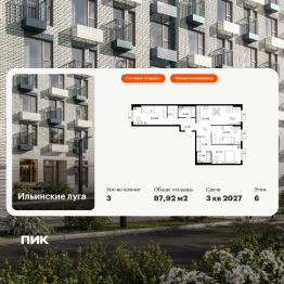 Продаётся 3-комн. квартира площадью 87,8 кв.м на 9 этаже 9 этажного дома (Корпус 2.8, Секция 6) проекта ПИК ''Ильинские луга''. Светлый просторный подъезд на уровне земли, функциональная планировка, большие окна, c отделкой. Жилой район ''Ильинские луга'' находится в 10 километрах от МКАД по Новорижскому шоссе, в 20 минутах на автомобиле от станций метро ''Волоколамская'', ''Тушинская'' и ''Строгино''. В будущем ближе к проекту, в 9 минутах на машине, откроется станция ''Ильинская''. ''Ильинские луга'' - масштабный проект, в который входит девять детских садов, четыре школы и поликлиника. Он строится в престижном и экологичном районе среди лесов и памятников природы. За 5 минут от жилого квартала можно доехать до Рублёво-Успенского шоссе, а за 30 минут - до центра Москвы. До крупного торгового центра ''РИГАМОЛЛ'' всего 5 минут на автомобиле, а до ТЦ ''Твой дом'' и гипермаркета ''Глобус'' - 10 минут. В ''Ильинских лугах'' строятся только девятиэтажные дома - такая архитектура соответствует спокойной жизни за городом. В каждом дворе-парке есть места для отдыха, детские и спортивные площадки. А ещё, здесь уже открыт большой PlayHub ''Гравити'' - современное игровое пространство с космической тематикой, холмами, зонами для игр и отдыха жителей любого возраста. На первых этажах уже работают магазины, кафе и пекарни. Места для отдыха от ''Ильинских лугов'' тоже недалеко: 10 минут на машине - и вы в музее-усадьбе ''Архангельское''. Также рядом находится Лохин остров - памятник природы, где водятся речные черепахи, есть места для кемпинга и возможность сплавиться по реке. Артикул 943049 (Застройщик ООО ''СЗ ''ГРАДОЛИМП'')