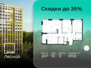 Цена указана с учётом скидки при 100%-й оплате, несубсидированной ипотеке, рассрочке (кроме программы ''Рассрочка 0%'').В районе, утопающем в густой зелени лесов, многочисленных парков и скверов, продаётся 3-комнатная квартира площадью 69.60 кв.м с отделкой white box. Квартира расположена на 13 этаже в жилом комплексе комфорт-класса Level Лесной (компания Level Group/Левел групп). Отличная транспортная доступность:- 25 мин. пешком до станции метро ''Пятницкое шоссе'',- 28 мин. на автобусе до станции метро и МЦД-2 ''Волоколамская'',- 11 мин. на авто до МКАД,- 25 мин. на авто до ТТК. Продуманный архитектурный проект:- Концепция проекта Level Лесной от бюро СПИЧ,- Высотность комплекса до 15 этажей с уникальными видами на лесные массивы и город, - Высота потолков до 3 м,- Современные окна высотой до 1,6 м, в части квартир предусмотрены окна в пол. Высота подоконников 0,6 м, Расположение:Level Лесной строится в зелёной зоне ближайшего Подмосковья, г.о. Красногорск в посёлке Отрадное. Шаговая и автомобильная доступность до метро и больших транспортных артерий города. За 25 минут вы дойдёте до станции метро ''Пятницкое шоссе'', а за 20 минут на машине сможете доехать до станции метро ''Тушинская''. Район окружен роскошной зеленью лесов и парковых зон, занимающих территорию свыше 1 000 гектаров. Помимо благоприятной экологии, здесь множество возможностей для активного отдыха и поддержания физической формы. Облагороженная территории с полностью развитой инфраструктурой. На территории проекта находится детский сад и школа ''Светлые Горы'', которая входит в список лучших частных школ от Forbes Education (по данным на 2023г.). Кроме того, в пешей доступности расположено ещё 8 детских садов, а также запланировано открытие современной муниципальной школы. В непосредственной близости находятся сетевые супермаркеты и локальные магазины, аптеки, клиники, почта, библиотека, салоны красоты, рестораны, спортивные и творческие секции, развивающие детские центры. В 12 минутах пешком расположен торговый парк ''Отрада'' с продуктовым и строительным гипермаркетами, магазинами, кинотеатром и развлечениями для детей. Внутренняя инфраструктура:Мы знаем, как важно, чтобы магазины и сервисы были всегда рядом. В сданных корпусах Level Лесной уже расположена полностью готовая развитая инфраструктура. На первых этажах корпуса 27 предусмотрено ещё 14 коммерческих помещений. Благоустройство:Продуманное пространство и аура приватного европейского городка рождают чувство лёгкости и расслабления у каждого, кто попадает на территорию проекта. Концепцию общественных площадок разработали в партнёрстве два архитектурных бюро: Highlight Architecture и SCAPE. В безопасных дворах без машин каждый обязательно найдёт себе место для вдохновения, отдыха и спорта.