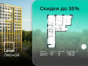 Цена указана с учётом скидки при 100%-й оплате, несубсидированной ипотеке, рассрочке (кроме программы ''Рассрочка 0%'').В районе, утопающем в густой зелени лесов, многочисленных парков и скверов, продаётся 3-комнатная квартира площадью 78.20 кв.м без отделки. Квартира расположена на 11 этаже в жилом комплексе комфорт-класса Level Лесной (компания Level Group/Левел групп). Отличная транспортная доступность:- 25 мин. пешком до станции метро ''Пятницкое шоссе'',- 28 мин. на автобусе до станции метро и МЦД-2 ''Волоколамская'',- 11 мин. на авто до МКАД,- 25 мин. на авто до ТТК. Продуманный архитектурный проект:- Концепция проекта Level Лесной от бюро СПИЧ,- Высотность комплекса до 15 этажей с уникальными видами на лесные массивы и город, - Высота потолков до 3 м,- Современные окна высотой до 1,6 м, в части квартир предусмотрены окна в пол. Высота подоконников 0,6 м, Расположение:Level Лесной строится в зелёной зоне ближайшего Подмосковья, г.о. Красногорск в посёлке Отрадное. Шаговая и автомобильная доступность до метро и больших транспортных артерий города. За 25 минут вы дойдёте до станции метро ''Пятницкое шоссе'', а за 20 минут на машине сможете доехать до станции метро ''Тушинская''. Район окружен роскошной зеленью лесов и парковых зон, занимающих территорию свыше 1 000 гектаров. Помимо благоприятной экологии, здесь множество возможностей для активного отдыха и поддержания физической формы. Облагороженная территории с полностью развитой инфраструктурой. На территории проекта находится детский сад и школа ''Светлые Горы'', которая входит в список лучших частных школ от Forbes Education (по данным на 2023г.). Кроме того, в пешей доступности расположено ещё 8 детских садов, а также запланировано открытие современной муниципальной школы. В непосредственной близости находятся сетевые супермаркеты и локальные магазины, аптеки, клиники, почта, библиотека, салоны красоты, рестораны, спортивные и творческие секции, развивающие детские центры. В 12 минутах пешком расположен торговый парк ''Отрада'' с продуктовым и строительным гипермаркетами, магазинами, кинотеатром и развлечениями для детей. Внутренняя инфраструктура:Мы знаем, как важно, чтобы магазины и сервисы были всегда рядом. В сданных корпусах Level Лесной уже расположена полностью готовая развитая инфраструктура. На первых этажах корпуса 27 предусмотрено ещё 14 коммерческих помещений. Благоустройство:Продуманное пространство и аура приватного европейского городка рождают чувство лёгкости и расслабления у каждого, кто попадает на территорию проекта. Концепцию общественных площадок разработали в партнёрстве два архитектурных бюро: Highlight Architecture и SCAPE. В безопасных дворах без машин каждый обязательно найдёт себе место для вдохновения, отдыха и спорта.