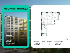 Цена указана с учётом скидки при 100%-й оплате, несубсидированной ипотеке, рассрочке (кроме программы ''Рассрочка 0%''). Субсидированная семейная ипотека. Полная стоимость кредита 20,963 - 23,237% годовых. Ставка 3,9% годовых. Первоначальный взнос от 20,01%. Сумма кредита до 12 млн. руб.В районе, утопающем в густой зелени лесов, многочисленных парков и скверов, продаётся 3-комнатная квартира площадью 78.20 кв.м без отделки. Квартира расположена на 11 этаже в жилом комплексе комфорт-класса Level Лесной (компания Level Group/Левел групп). Отличная транспортная доступность:- 25 мин. пешком до станции метро ''Пятницкое шоссе'',- 28 мин. на автобусе до станции метро и МЦД-2 ''Волоколамская'',- 11 мин. на авто до МКАД,- 25 мин. на авто до ТТК. Продуманный архитектурный проект:- Концепция проекта Level Лесной от бюро СПИЧ,- Высотность комплекса до 15 этажей с уникальными видами на лесные массивы и город, - Высота потолков до 3 м,- Современные окна высотой до 1,6 м, в части квартир предусмотрены окна в пол. Высота подоконников 0,6 м, Расположение:Level Лесной строится в зелёной зоне ближайшего Подмосковья, г.о. Красногорск в посёлке Отрадное. Шаговая и автомобильная доступность до метро и больших транспортных артерий города. За 25 минут вы дойдёте до станции метро ''Пятницкое шоссе'', а за 20 минут на машине сможете доехать до станции метро ''Тушинская''. Район окружен роскошной зеленью лесов и парковых зон, занимающих территорию свыше 1 000 гектаров. Помимо благоприятной экологии, здесь множество возможностей для активного отдыха и поддержания физической формы. Облагороженная территории с полностью развитой инфраструктурой. На территории проекта находится детский сад и школа ''Светлые Горы'', которая входит в список лучших частных школ от Forbes Education (по данным на 2023г.). Кроме того, в пешей доступности расположено ещё 8 детских садов, а также запланировано открытие современной муниципальной школы. В непосредственной близости находятся сетевые супермаркеты и локальные магазины, аптеки, клиники, почта, библиотека, салоны красоты, рестораны, спортивные и творческие секции, развивающие детские центры. В 12 минутах пешком расположен торговый парк ''Отрада'' с продуктовым и строительным гипермаркетами, магазинами, кинотеатром и развлечениями для детей. Внутренняя инфраструктура:Мы знаем, как важно, чтобы магазины и сервисы были всегда рядом. В сданных корпусах Level Лесной уже расположена полностью готовая развитая инфраструктура. На первых этажах корпуса 27 предусмотрено ещё 14 коммерческих помещений. Благоустройство:Продуманное пространство и аура приватного европейского городка рождают чувство лёгкости и расслабления у каждого, кто попадает на территорию проекта. Концепцию общественных площадок разработали в партнёрстве два архитектурных бюро: Highlight Architecture и SCAPE. В безопасных дворах без машин каждый обязательно найдёт себе место для вдохновения, отдыха и спорта.