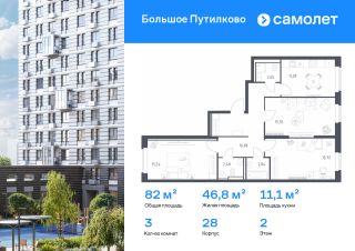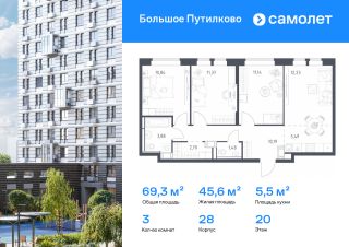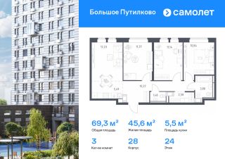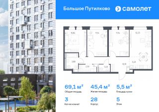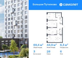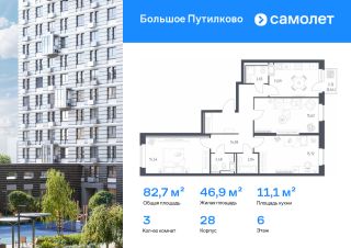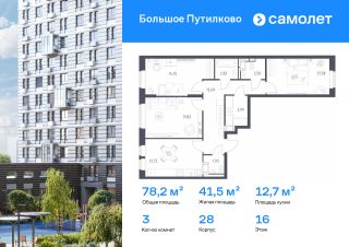 Предлагается 3-комнатная квартира комфорт-класса 76,62 кв.м в корпусе 28 на 15 этаже, в ЖК ''Большое Путилково''Квартира с чистовой отделкой. Доступность дополнительных опций уточняйте у застройщика.Планировкой предусмотрены:Коридор_1 - 10,38 м²Кухня-ниша_1 - 4,89 м²Гостиная_1 - 11,64 м²Жилая_комната_1 - 12,61 м²Жилая_комната_2 - 11,09 м²Жилая_комната_3 - 15,29 м²СУ_1 - 2,37 м²СУ_2 - 3,9 м²Гардеробная_1 - 3,81 м²Балкон_1 - 0,64 м²Приобрести квартиру возможно по специальным акциям от застройщика, с текущими условиями акций можно ознакомиться в блоке Акций.Цена динамическая и может отличаться, уточняйте актуальность у застройщика.''Большое Путилково'' — масштабный жилой комплекс рядом с Алешкинским и Новогорским лесопарками. Мы уже построили и открыли 3 детских сада и школу, на первых этажах корпусов работают магазины, аптеки, кафе и пекарни. Удобное расположение проекта позволяет всего за 10 минут добраться до 4 станций метро.Во дворах обустроены детские площадки и зоны для отдыха. Все квартиры сдаются с готовой отделкой - переезжайте сразу после получения ключей!
