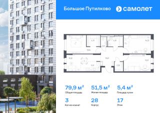 Строим кварталы для жизни с заботой о будущем. Предлагается 3-комнатная квартира комфорт-класса 79,88 кв.м в корпусе 28 на 17 этаже, в ЖК ''Большое Путилково''Квартира с чистовой отделкой. Доступность дополнительных опций уточняйте у застройщика.Приобрести квартиру возможно по специальным акциям от застройщика, с текущими условиями акций можно ознакомиться в блоке ''Акций''.Цена динамическая и может отличаться, уточняйте актуальность у застройщика.''Большое Путилково'' — масштабный жилой комплекс рядом с Алешкинским и Новогорским лесопарками. Мы уже построили и открыли 3 детских сада и школу, на первых этажах корпусов работают магазины, аптеки, кафе и пекарни. Удобное расположение проекта позволяет всего за 10 минут добраться до 4 станций метро.Во дворах обустроены детские площадки и зоны для отдыха. Все квартиры сдаются с готовой отделкой - переезжайте сразу после получения ключей!