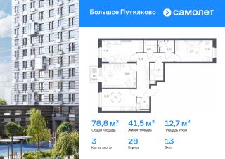 Строим кварталы для жизни с заботой о будущем. Предлагается 3-комнатная квартира комфорт-класса 78,79 кв.м в корпусе 28 на 13 этаже, в ЖК ''Большое Путилково''Квартира с чистовой отделкой. Доступность дополнительных опций уточняйте у застройщика.Приобрести квартиру возможно по специальным акциям от застройщика, с текущими условиями акций можно ознакомиться в блоке ''Акций''.Цена динамическая и может отличаться, уточняйте актуальность у застройщика.''Большое Путилково'' — масштабный жилой комплекс рядом с Алешкинским и Новогорским лесопарками. Мы уже построили и открыли 3 детских сада и школу, на первых этажах корпусов работают магазины, аптеки, кафе и пекарни. Удобное расположение проекта позволяет всего за 10 минут добраться до 4 станций метро.Во дворах обустроены детские площадки и зоны для отдыха. Все квартиры сдаются с готовой отделкой - переезжайте сразу после получения ключей!