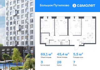 Предлагается 3-комнатная квартира комфорт-класса 69,09 кв.м в корпусе 28 на 7 этаже, в ЖК ''Большое Путилково''Квартира с чистовой отделкой. Доступность дополнительных опций уточняйте у застройщика.Приобрести квартиру возможно по специальным акциям от застройщика, с текущими условиями акций можно ознакомиться в блоке ''Акций''.Цена динамическая и может отличаться, уточняйте актуальность у застройщика.''Большое Путилково'' — масштабный жилой комплекс рядом с Алешкинским и Новогорским лесопарками. Мы уже построили и открыли 3 детских сада и школу, на первых этажах корпусов работают магазины, аптеки, кафе и пекарни. Удобное расположение проекта позволяет всего за 10 минут добраться до 4 станций метро.Во дворах обустроены детские площадки и зоны для отдыха. Все квартиры сдаются с готовой отделкой - переезжайте сразу после получения ключей!