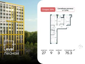 Цена указана с учётом скидки при 100%-й оплате, несубсидированной ипотеке, рассрочке (кроме программы ''Рассрочка 0%''). Субсидированная семейная ипотека. Полная стоимость кредита 20,963 - 23,237% годовых. Ставка 3,9% годовых. Первоначальный взнос от 20,01%. Сумма кредита до 12 млн. руб.В районе, утопающем в густой зелени лесов, многочисленных парков и скверов, продаётся 3-комнатная квартира площадью 75.30 кв.м с отделкой white box. Квартира расположена на 9 этаже в жилом комплексе комфорт-класса Level Лесной (компания Level Group/Левел групп). Отличная транспортная доступность- 25 мин. пешком до станции метро ''Пятницкое шоссе'',- 28 мин. на общественном транспорте до станции метро и МЦД-2 ''Волоколамская'',- 11 мин. на авто до МКАД,- 25 мин. на авто до ТТК.Продуманный архитектурный проект- Концепция проекта Level Лесной от бюро СПИЧ,- Высотность комплекса до 15 этажей с уникальными видами на лесные массивы и город,- Высота потолков до 3 м,- Современные окна высотой до 1,6 м, в части квартир предусмотрены окна в пол. Высота подоконников 0,6 м,РасположениеLevel Лесной строится в зелёной зоне ближайшего Подмосковья, г.о. Красногорск в посёлке Отрадное. Шаговая и автомобильная доступность до метро и больших транспортных артерий города. За 25 минут вы дойдёте до станции метро ''Пятницкое шоссе'' - одной из самых свободных станций Арбатско-Покровской линии, а за 20 минут на машине сможете доехать до станции метро ''Тушинская''. Район окружен роскошной зеленью лесов и парковых зон, занимающих территорию свыше 1 000 гектаров. Помимо благоприятной экологии, здесь множество возможностей для активного отдыха и поддержания физической формы. Облагороженная территории с полностью развитой инфраструктурой. На территории проекта находится детский сад и школа ''Светлые Горы'', которая входит в список лучших частных школ от Forbes Education (по данным на 2023г.). Кроме того, в пешей доступности расположено ещё 8 детских садов, а также запланировано открытие современной муниципальной школы. В непосредственной близости находятся сетевые супермаркеты и локальные магазины, аптеки, клиники, почта, библиотека, салоны красоты, рестораны, спортивные и творческие секции, развивающие детские центры. В 12 минутах пешком расположен торговый парк ''Отрада'' с продуктовым и строительным гипермаркетами, магазинами, кинотеатром и развлечениями для детей.Внутренняя инфраструктураМы знаем, как важно, чтобы магазины и сервисы были всегда рядом. В сданных корпусах Level Лесной уже расположена полностью готовая развитая инфраструктура. На первых этажах корпуса 27 предусмотрено ещё 14 коммерческих помещений.БлагоустройствоПродуманное пространство и аура приватного европейского городка рождают чувство лёгкости и расслабления у каждого, кто попадает на территорию проекта. Концепцию общественных площадок разработали в партнёрстве два архитектурных бюро: Highlight Architecture и SCAPE. В безопасных дворах без машин каждый обязательно найдёт себе место для вдо