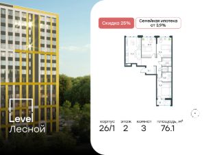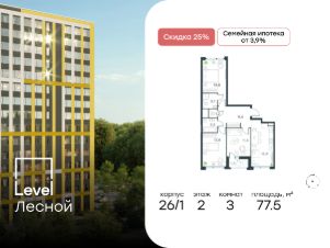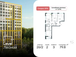 Цена указана с учётом скидки при 100%-й оплате, несубсидированной ипотеке, рассрочке (кроме программы ''Рассрочка 0%''). Субсидированная семейная ипотека. Полная стоимость кредита 20,963 - 23,237% годовых. Ставка 3,9% годовых. Первоначальный взнос от 20,01%. Сумма кредита до 12 млн. руб.В районе, утопающем в густой зелени лесов, многочисленных парков и скверов, продаётся 3-комнатная квартира площадью 82.50 кв.м с отделкой white box. Квартира расположена на 2 этаже в жилом комплексе комфорт-класса Level Лесной (компания Level Group/Левел групп). Отличная транспортная доступность- 25 мин. пешком до станции метро ''Пятницкое шоссе'',- 28 мин. на общественном транспорте до станции метро и МЦД-2 ''Волоколамская'',- 11 мин. на авто до МКАД,- 25 мин. на авто до ТТК.Продуманный архитектурный проект- Концепция проекта Level Лесной от бюро СПИЧ,- Высотность комплекса до 15 этажей с уникальными видами на лесные массивы и город,- Высота потолков до 3 м,- Современные окна высотой до 1,6 м, в части квартир предусмотрены окна в пол. Высота подоконников 0,6 м,РасположениеLevel Лесной строится в зелёной зоне ближайшего Подмосковья, г.о. Красногорск в посёлке Отрадное. Шаговая и автомобильная доступность до метро и больших транспортных артерий города. За 25 минут вы дойдёте до станции метро ''Пятницкое шоссе'' - одной из самых свободных станций Арбатско-Покровской линии, а за 20 минут на машине сможете доехать до станции метро ''Тушинская''. Район окружен роскошной зеленью лесов и парковых зон, занимающих территорию свыше 1 000 гектаров. Помимо благоприятной экологии, здесь множество возможностей для активного отдыха и поддержания физической формы. Облагороженная территории с полностью развитой инфраструктурой. На территории проекта находится детский сад и школа ''Светлые Горы'', которая входит в список лучших частных школ от Forbes Education (по данным на 2023г.). Кроме того, в пешей доступности расположено ещё 8 детских садов, а также запланировано открытие современной муниципальной школы. В непосредственной близости находятся сетевые супермаркеты и локальные магазины, аптеки, клиники, почта, библиотека, салоны красоты, рестораны, спортивные и творческие секции, развивающие детские центры. В 12 минутах пешком расположен торговый парк ''Отрада'' с продуктовым и строительным гипермаркетами, магазинами, кинотеатром и развлечениями для детей.Внутренняя инфраструктураМы знаем, как важно, чтобы магазины и сервисы были всегда рядом. В сданных корпусах Level Лесной уже расположена полностью готовая развитая инфраструктура. На первых этажах корпуса 27 предусмотрено ещё 14 коммерческих помещений.БлагоустройствоПродуманное пространство и аура приватного европейского городка рождают чувство лёгкости и расслабления у каждого, кто попадает на территорию проекта. Концепцию общественных площадок разработали в партнёрстве два архитектурных бюро: Highlight Architecture и SCAPE. В безопасных дворах без машин каждый обязательно найдёт себе место для вдо