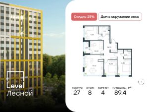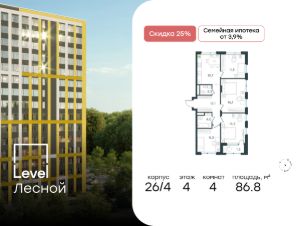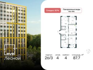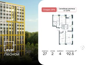 Цена указана с учётом скидки при 100%-й оплате, несубсидированной ипотеке, рассрочке (кроме программы ''Рассрочка 0%''). Субсидированная семейная ипотека. Полная стоимость кредита 20,963 - 23,237% годовых. Ставка 3,9% годовых. Первоначальный взнос от 20,01%. Сумма кредита до 12 млн. руб.В районе, утопающем в густой зелени лесов, многочисленных парков и скверов, продаётся 4-комнатная квартира площадью 92.50 кв.м с отделкой white box. Квартира расположена на 2 этаже в жилом комплексе комфорт-класса Level Лесной (компания Level Group/Левел групп). Отличная транспортная доступность- 25 мин. пешком до станции метро ''Пятницкое шоссе'',- 28 мин. на общественном транспорте до станции метро и МЦД-2 ''Волоколамская'',- 11 мин. на авто до МКАД,- 25 мин. на авто до ТТК.Продуманный архитектурный проект- Концепция проекта Level Лесной от бюро СПИЧ,- Высотность комплекса до 15 этажей с уникальными видами на лесные массивы и город,- Высота потолков до 3 м,- Современные окна высотой до 1,6 м, в части квартир предусмотрены окна в пол. Высота подоконников 0,6 м,РасположениеLevel Лесной строится в зелёной зоне ближайшего Подмосковья, г.о. Красногорск в посёлке Отрадное. Шаговая и автомобильная доступность до метро и больших транспортных артерий города. За 25 минут вы дойдёте до станции метро ''Пятницкое шоссе'' - одной из самых свободных станций Арбатско-Покровской линии, а за 20 минут на машине сможете доехать до станции метро ''Тушинская''. Район окружен роскошной зеленью лесов и парковых зон, занимающих территорию свыше 1 000 гектаров. Помимо благоприятной экологии, здесь множество возможностей для активного отдыха и поддержания физической формы. Облагороженная территории с полностью развитой инфраструктурой. На территории проекта находится детский сад и школа ''Светлые Горы'', которая входит в список лучших частных школ от Forbes Education (по данным на 2023г.). Кроме того, в пешей доступности расположено ещё 8 детских садов, а также запланировано открытие современной муниципальной школы. В непосредственной близости находятся сетевые супермаркеты и локальные магазины, аптеки, клиники, почта, библиотека, салоны красоты, рестораны, спортивные и творческие секции, развивающие детские центры. В 12 минутах пешком расположен торговый парк ''Отрада'' с продуктовым и строительным гипермаркетами, магазинами, кинотеатром и развлечениями для детей.Внутренняя инфраструктураМы знаем, как важно, чтобы магазины и сервисы были всегда рядом. В сданных корпусах Level Лесной уже расположена полностью готовая развитая инфраструктура. На первых этажах корпуса 27 предусмотрено ещё 14 коммерческих помещений.БлагоустройствоПродуманное пространство и аура приватного европейского городка рождают чувство лёгкости и расслабления у каждого, кто попадает на территорию проекта. Концепцию общественных площадок разработали в партнёрстве два архитектурных бюро: Highlight Architecture и SCAPE. В безопасных дворах без машин каждый обязательно найдёт себе место для вдо