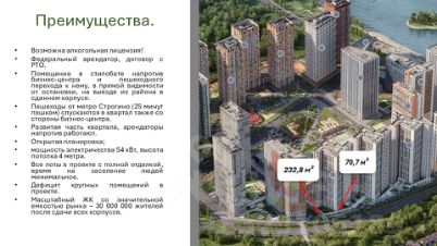 Лот 149238.Предлагается в продажу торговое помещение с арендатором в монолитном 34-х этажном жилом доме, расположенном по адресу:Мо., г.о. Красногорск, к15 на против школы ''Самолетум''. (ЖК ''Квартал Спутник'', корпус 15, стилобат 3) Ближайшие станции метро: м. Строгино 15 мин. на транспорте, м. Мякинино - 10 мин. на транспорте. До будущей станции метро Липовая роща 3 мин. пешком (начато строительство в 2023 году, открытие 2027 год). Всего в проекте планируется 24 корпуса с собственной инфраструктурой и ландшафтным парком. Квартал расположен в 500 м от МКАД и имеет прямые выезды на Мякининское и Новорижское шоссе. Рядом с корпусами две автобусные остановки. Все квартиры в квартале ''Спутник'' это видовые апартаменты с отделкой в домах 32-38 этажности с видом на Москва реку. В шаговой доступности шикарный пляж и проминад на Москва-реке. Планируемое кол-во жителей 30 000 человек. Уже проживают свыше 10 000 человек. Первая очередь сдана и полностью заселена, свободных помещений нет. Дефицит коммерческих помещений.Корпус сдан. Ключи в марте 25.Технические характеристики:Площадь: 152.4 м2, первый этаж, назначение: свободное, количество входов: 2, количество этажей в помещении: 1 , высота потолков: 4.0м (возможна организация антресоли), витринное остекление, Выделенная мощность: 27кВт (180 вт на 1 м2), есть возможность увеличения. ХВС. ГВС, канализация. Приточно-вытяжная вентиляция.Коммерческие условия:Стоимость продажи: 100 000 000 рублей.Стоимость за м2: 666 667 рублей.Арендаторы: сеть товаров повседневного спроса Улыбка Радуги, ПДА, 10 лет., индексация.МАП общий: 750 000 рублей.ГАП общий: 9 000 000 рублей.Окупаемость: 10,5 лет.