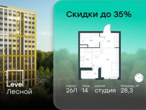 Цена указана с учётом скидки при 100%-й оплате, несубсидированной ипотеке, рассрочке (кроме программы ''Рассрочка 0%'').В районе, утопающем в густой зелени лесов, многочисленных парков и скверов, продаётся студия площадью 28.30 кв.м с отделкой white box. Квартира расположена на 14 этаже в жилом комплексе комфорт-класса Level Лесной (компания Level Group/Левел групп). Отличная транспортная доступность:- 25 мин. пешком до станции метро ''Пятницкое шоссе'',- 28 мин. на автобусе до станции метро и МЦД-2 ''Волоколамская'',- 11 мин. на авто до МКАД,- 25 мин. на авто до ТТК. Продуманный архитектурный проект:- Концепция проекта Level Лесной от бюро СПИЧ,- Высотность комплекса до 15 этажей с уникальными видами на лесные массивы и город, - Высота потолков до 3 м,- Современные окна высотой до 1,6 м, в части квартир предусмотрены окна в пол. Высота подоконников 0,6 м, Расположение:Level Лесной строится в зелёной зоне ближайшего Подмосковья, г.о. Красногорск в посёлке Отрадное. Шаговая и автомобильная доступность до метро и больших транспортных артерий города. За 25 минут вы дойдёте до станции метро ''Пятницкое шоссе'', а за 20 минут на машине сможете доехать до станции метро ''Тушинская''. Район окружен роскошной зеленью лесов и парковых зон, занимающих территорию свыше 1 000 гектаров. Помимо благоприятной экологии, здесь множество возможностей для активного отдыха и поддержания физической формы. Облагороженная территории с полностью развитой инфраструктурой. На территории проекта находится детский сад и школа ''Светлые Горы'', которая входит в список лучших частных школ от Forbes Education (по данным на 2023г.). Кроме того, в пешей доступности расположено ещё 8 детских садов, а также запланировано открытие современной муниципальной школы. В непосредственной близости находятся сетевые супермаркеты и локальные магазины, аптеки, клиники, почта, библиотека, салоны красоты, рестораны, спортивные и творческие секции, развивающие детские центры. В 12 минутах пешком расположен торговый парк ''Отрада'' с продуктовым и строительным гипермаркетами, магазинами, кинотеатром и развлечениями для детей. Внутренняя инфраструктура:Мы знаем, как важно, чтобы магазины и сервисы были всегда рядом. В сданных корпусах Level Лесной уже расположена полностью готовая развитая инфраструктура. На первых этажах корпуса 27 предусмотрено ещё 14 коммерческих помещений. Благоустройство:Продуманное пространство и аура приватного европейского городка рождают чувство лёгкости и расслабления у каждого, кто попадает на территорию проекта. Концепцию общественных площадок разработали в партнёрстве два архитектурных бюро: Highlight Architecture и SCAPE. В безопасных дворах без машин каждый обязательно найдёт себе место для вдохновения, отдыха и спорта.