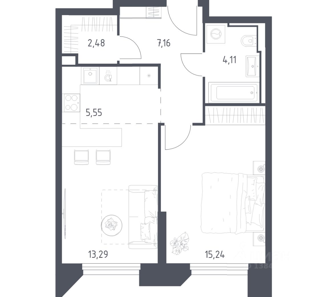 Строим кварталы для жизни с заботой о будущем. Предлагается 1-комнатная квартира комфорт-класса площадью 41,74 кв.м в корпусе 2 на 15-м этаже, в жилом комплексе ''Квартал Строгино''. В варианте без отделки мы установили окна и входную дверь, завели в квартиру коммуникации. Получайте ключи и начните создавать интерьер мечты в новой квартире. В варианте с предчистовой отделкой мы развели коммуникации по помещениям, выровняли и зашпаклевали стены, подготовили пол к чистовому покрытию. Ваша будущая квартира готова к финишному ремонту. Осталось выбрать, какие оттенки будут в вашем интерьере и воплотить дизайнерские идеи. В варианте с готовой отделкой мы поклеили обои под покраску, постелили полы в комнатах и санузлах, выполнили отделку стен. Установили сантехнику и межкомнатные двери, провели электрику. Это лучшее соотношение цены, качества и затраченного времени. Осталось только выбрать место для обеденного стола и удобного дивана. Приобрести квартиру возможно по специальным акциям от застройщика, с текущими условиями акций можно ознакомиться в блоке ''Акций''. Цена динамическая и может отличаться, уточняйте актуальность у застройщика. В жилом комплексе ''Квартал Строгино'' вас ждет широкий выбор досуга. Рядом МКАД и выезд на Новорижское шоссе и станции метро ''Строгино'' и ''Мякинино''. В пешей доступности — Живописная бухта, можно доехать до ''Липовой Рощи'' и ''Серебряного бора''. На территории комплекса будут 2 детских сада, школа и поликлиника. Двор-парк с площадками, велодорожками и паркингами. В лобби есть помещения для колясок. Квартиры с готовой отделкой и видом на бухту.