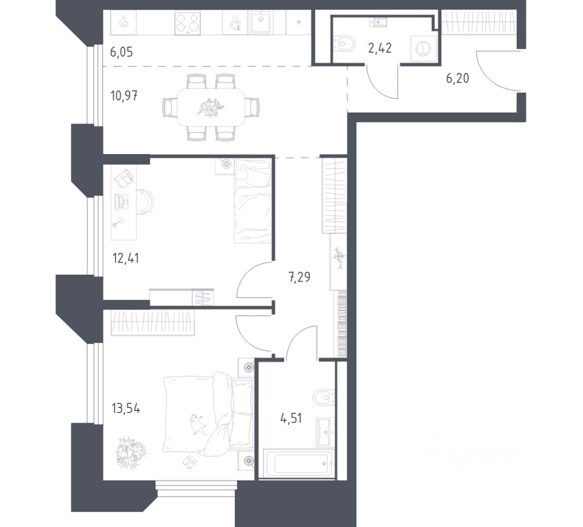 Строим кварталы для жизни с заботой о будущем. Предлагается 2-комнатная квартира комфорт-класса площадью 58,88 кв.м в корпусе 2 на 24-м этаже, в жилом комплексе ''Квартал Строгино''. В варианте без отделки мы установили окна и входную дверь, завели в квартиру коммуникации. Получайте ключи и начните создавать интерьер мечты в новой квартире. В варианте с предчистовой отделкой мы развели коммуникации по помещениям, выровняли и зашпаклевали стены, подготовили пол к чистовому покрытию. Ваша будущая квартира готова к финишному ремонту. Осталось выбрать, какие оттенки будут в вашем интерьере и воплотить дизайнерские идеи. В варианте с готовой отделкой мы поклеили обои под покраску, постелили полы в комнатах и санузлах, выполнили отделку стен. Установили сантехнику и межкомнатные двери, провели электрику. Это лучшее соотношение цены, качества и затраченного времени. Осталось только выбрать место для обеденного стола и удобного дивана. Приобрести квартиру возможно по специальным акциям от застройщика, с текущими условиями акций можно ознакомиться в блоке ''Акций''. Цена динамическая и может отличаться, уточняйте актуальность у застройщика. В жилом комплексе ''Квартал Строгино'' вас ждет широкий выбор досуга. Рядом МКАД и выезд на Новорижское шоссе и станции метро ''Строгино'' и ''Мякинино''. В пешей доступности — Живописная бухта, можно доехать до ''Липовой Рощи'' и ''Серебряного бора''. На территории комплекса будут 2 детских сада, школа и поликлиника. Двор-парк с площадками, велодорожками и паркингами. В лобби есть помещения для колясок. Квартиры с готовой отделкой и видом на бухту.