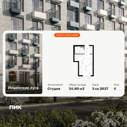 Продаётся квартира-студия площадью 24,6 кв.м на 4 этаже 9 этажного дома (Корпус 4.3, Секция 2) проекта ПИК Ильинские луга. Светлый просторный подъезд на уровне земли, функциональная планировка, большие окна, предчистовая отделка. Жилой район ''Ильинские луга'' находится в 10 километрах от МКАД по Новорижскому шоссе, в 20 минутах на автомобиле от станций метро ''Волоколамская'', ''Тушинская'' и ''Строгино''. В будущем ближе к проекту, в 9 минутах пути на машине, откроется станция ''Ильинская'' Рублёво-Архангельской линии, которая будет соединять Арбатско-Покровскую линию и Большую кольцевую линию.Сейчас в квартале начались продажи в корпусах 3.2, 3.3, 3.4, 3.5 и 3.6.''Ильинские луга'' — масштабный проект, в который входит девять детских садов, четыре школы и поликлиника. Он строится в престижном и экологичном районе среди лесов и памятников природы. За 5 минут от жилого квартала можно доехать до Рублёво-Успенского шоссе, а за 30 минут — до центра Москвы. До крупного торгового центра ''РИГАМОЛЛ'' всего 5 минут на автомобиле, а до ТЦ ''Твой дом'' и гипермаркета ''Глобус'' — 10 минут.В ''Ильинских лугах'' строятся только девятиэтажные дома — такая архитектура соответствует спокойной жизни за городом. В каждом дворе-парке есть места для отдыха, детские и спортивные площадки. А ещё, здесь уже открыт большой PlayHub ''Гравити'' — современное игровое пространство с космической тематикой, холмами, зонами для игр и отдыха жителей любого возраста.На первых этажах уже работают магазины, кафе и пекарни.Места для отдыха от ''Ильинских лугов'' тоже недалеко: 10 минут на машине — и вы в музее-усадьбе ''Архангельское''. Также рядом находится Лохин остров — памятник природы, где водятся речные черепахи, есть места для кемпинга и возможность сплавиться по реке. Артикул 1011896 (Застройщик ООО ''СЗ ''ГРАДОЛИМП'')